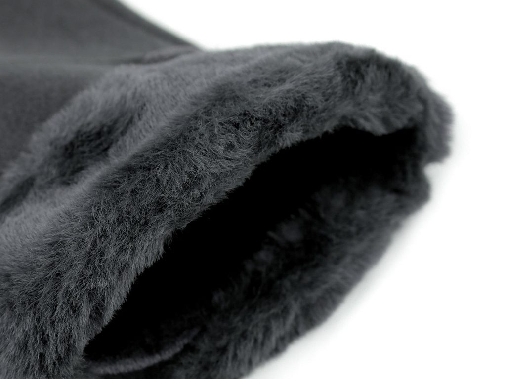 Elegantní dámské rukavice zdobí kožešinový lem a malý knoflík. Rukavice jsou jemně pružné. Povrch rukavic připomíná broušenou kůži. Uvnitř mají jemný plyš, jenž je velice příjemný na dotek. Hodí se do mírné zimy nebo do chladnějšího podzimního počasí.Na ukazováčku pravé i levé ruky je vyšitý květ, díky kterému můžete ovládat dotykové přístroje - mobil, tablet, bankomat apod.