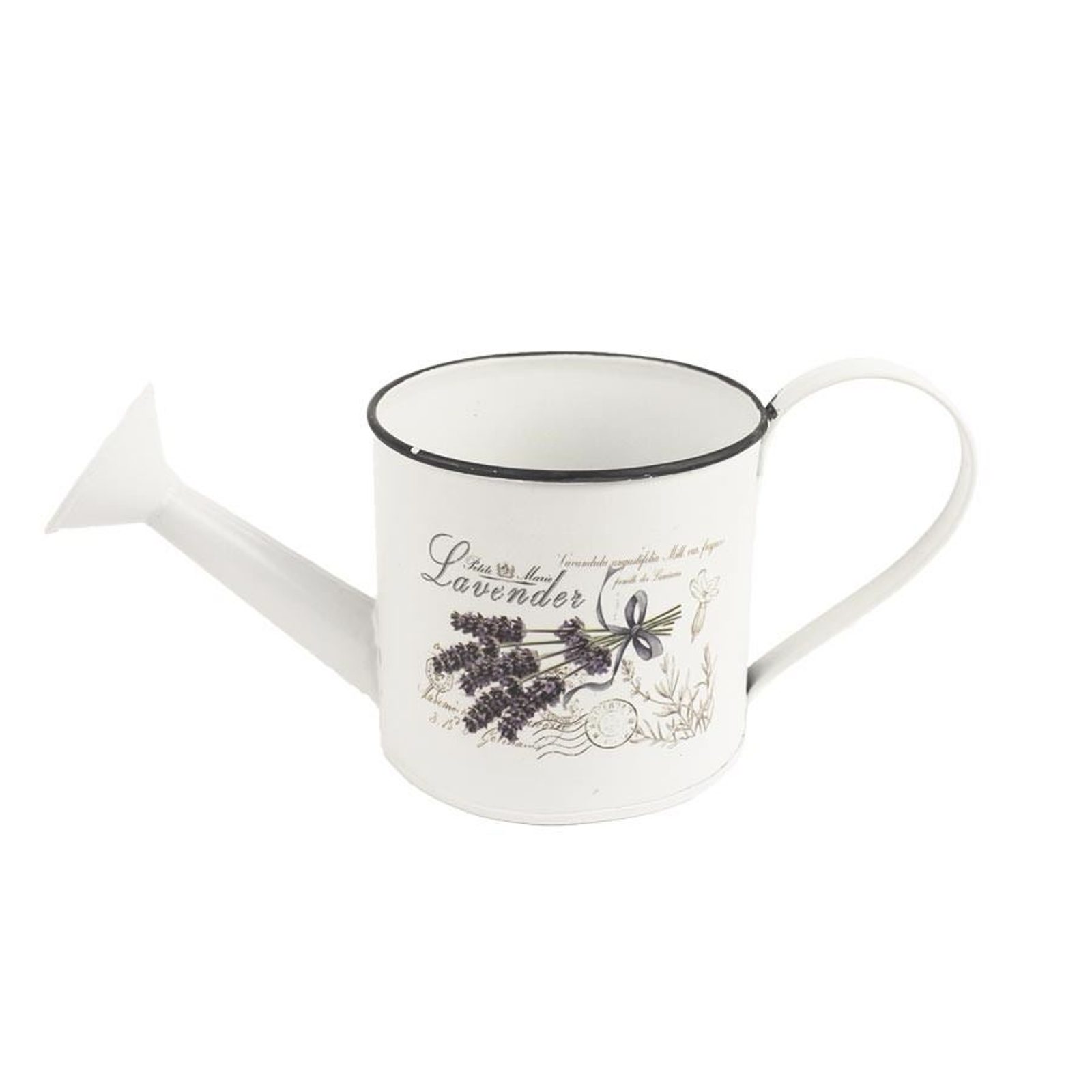 Konvička plechová s motivem Levandule. Konvička má rozměry 27 x 11 cm, výšku 11,5 cm. Konvička slouží k dekoraci, nedoporučujeme plnit vodou. Barva : kombinace bílá s fialovou. Materiál : plech.