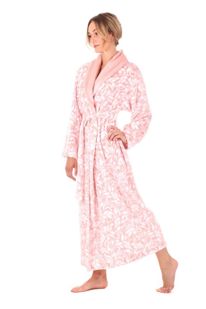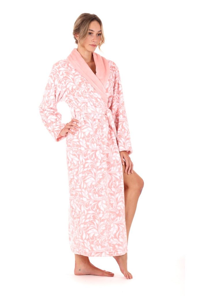 Příjemný župan se šálovým lícem s květinovým vzorem - kombinace perlově růžové a bílé barvy.