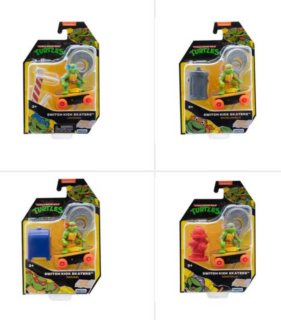 Teenage Mutant Ninja Turtles Switch Kick Skaters je auto-stabilizační skateboard, který vám umožní předvádět skvělé skate triky a pokaždé přistát na všech čtyřech kolech. Auto-stabilizační mechanismus (gyro) uvnitř skateboardu je napájen natahovacím lankem. Stačí zasunout natahovací lanko do skateboardu, vytáhnout a můžete začít provádět ty nejlepší triky s želvami Ninja. Nasbírejte všechny 4 postavy.Rozměry balení (š v h): 14 x 20,5 x 5,5cm