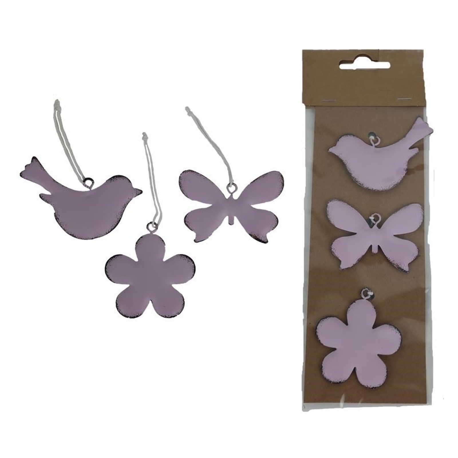 Sada dekorací k zavěšení. Sada obsahuje 3 dekorace. Rozměry : 5 - 6,5 x 0,3 cm, výška 4 - 5,7 cm. Barva : fialová. Materiál : kov.