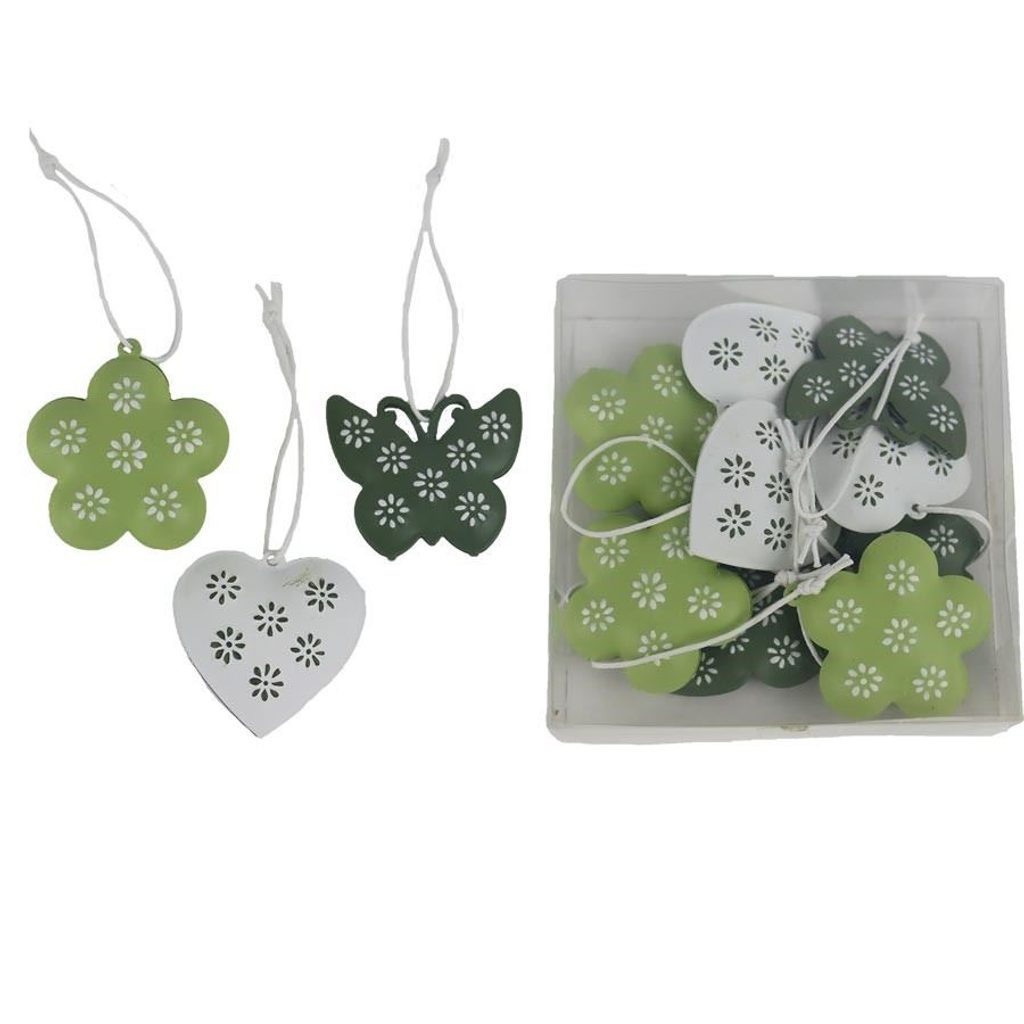 Sada dekorací k zavěšení. Sada obsahuje 9 dekorací. Rozměry : 4 x 1,2 cm, výška 3,2 - 4 cm. Barva : kombinace bílá, zelená, olivová. Materiál : kov.