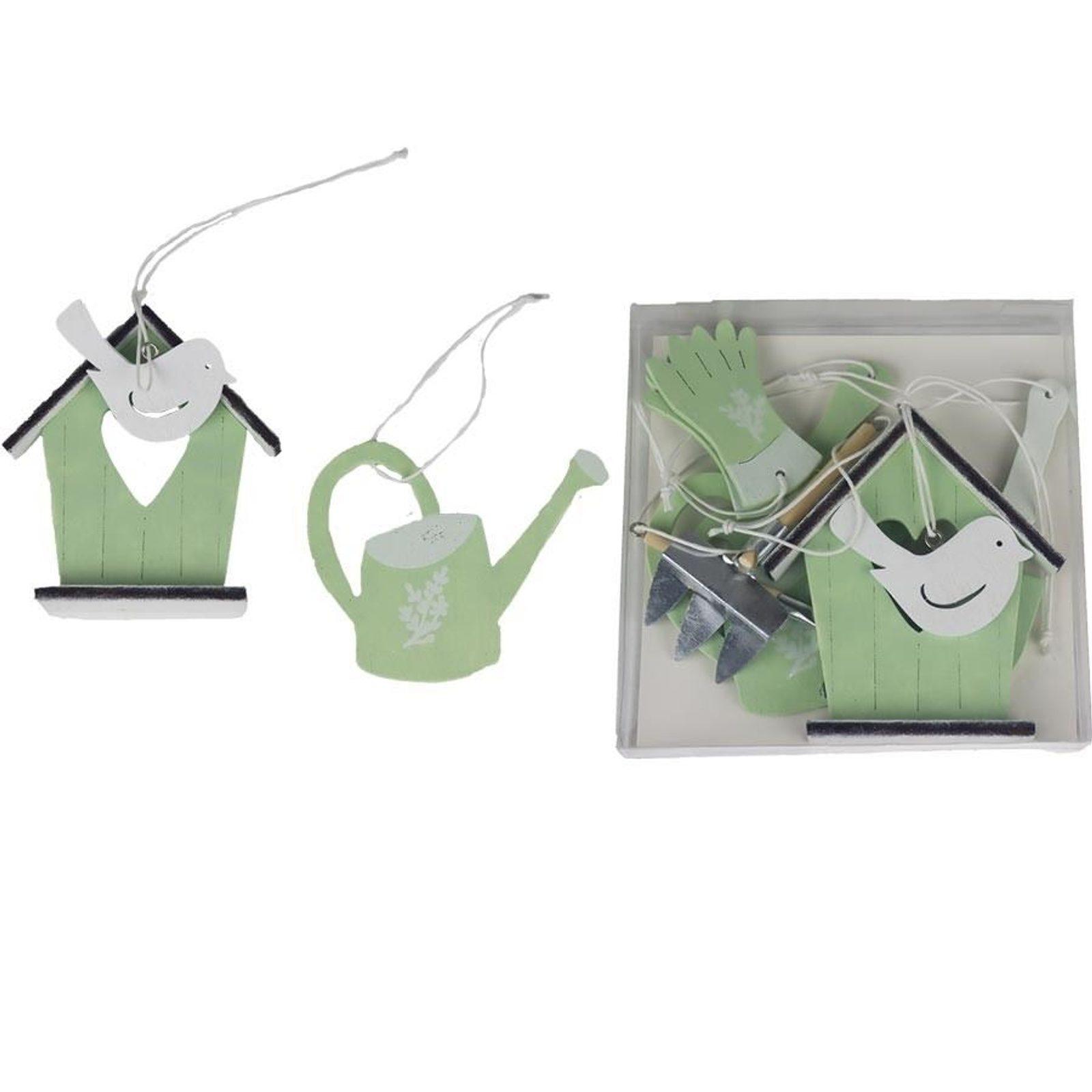 Sada dekorací k zavěšení. Sada obsahuje 7 dekorací. Rozměry : 3,5 - 8 x 0,5 - 1 cm, výška 6 - 10 cm. Barva : kombinace zelená s bílou. Materiál na bázi dřeva.