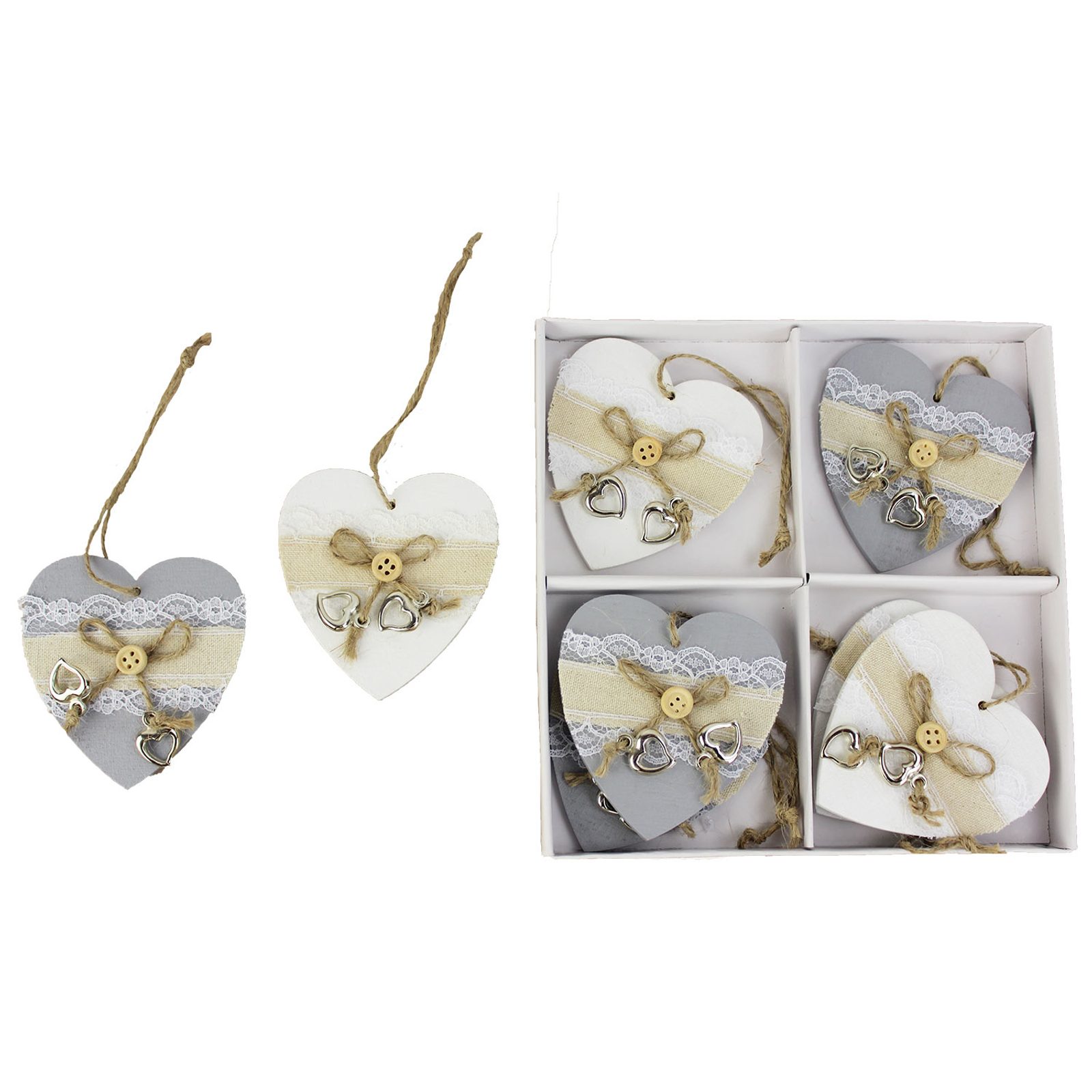 Sada dřevěných srdíček k zavěšení. Sada obsahuje 8 kusů, 4 bílé a 4 šedé srdíčka. Rozměry : 7 x 7,5 cm, tloušťka 0,5 cm. Barva : bílá, šedá. Materiál : dřevo.