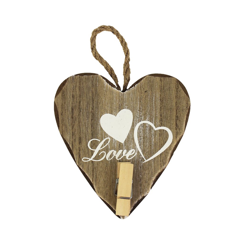 Držák na fotografii ve tvaru srdce s kolíčkem a nápisem Love. Srdce má šířku 12 cm, tloušťku 1,6 cm, výšku 13 cm. Barva : kombinace šedá s bílou. Materiál : dřevo.