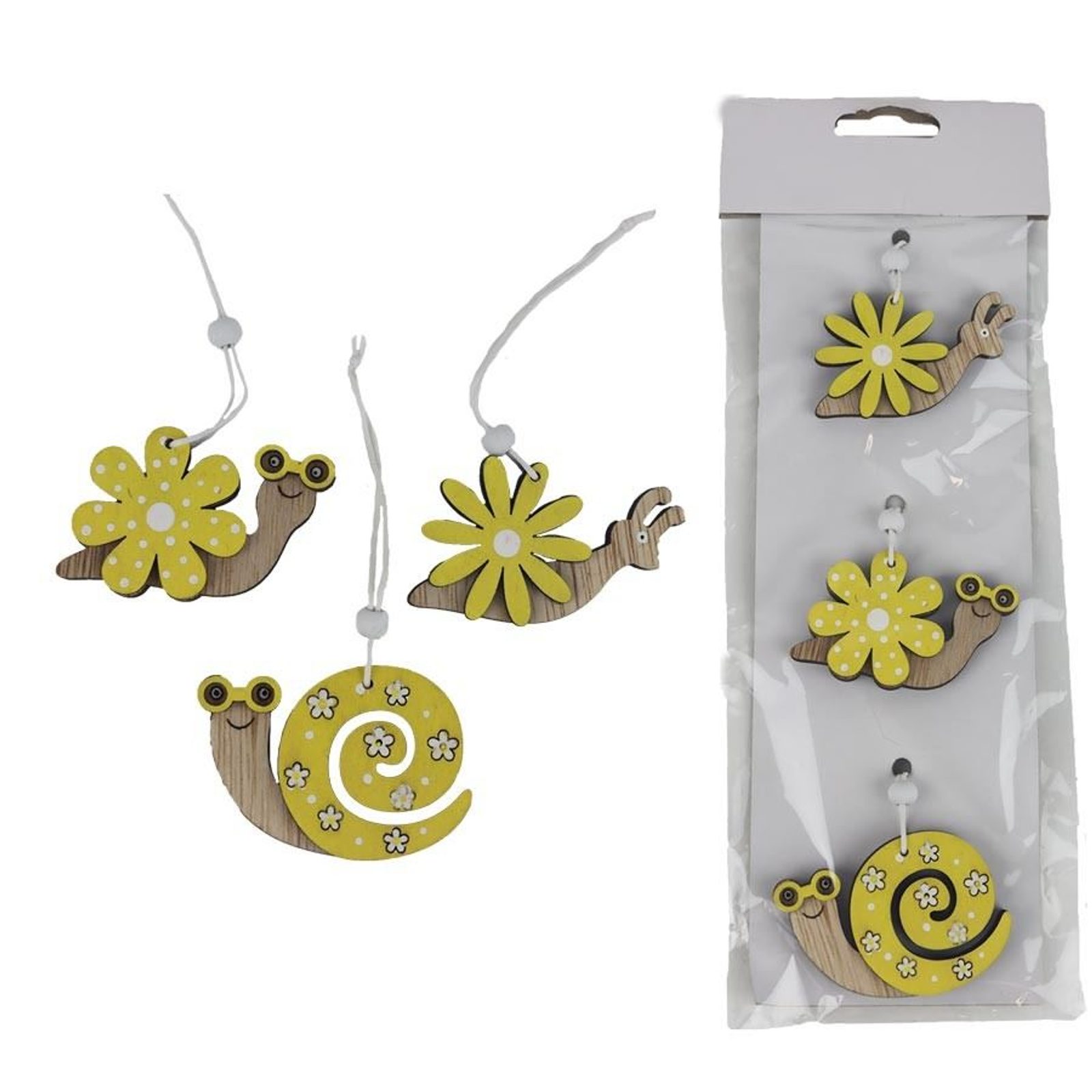 Sada dekoračních hlemýžďů k zavěšení. Sada obsahuje 3 hlemýždě. Rozměry : 6,5 x 0,6 cm, výška 3,6 - 4,2 cm. Barva : kombinace přírodní, žlutá. Materiál na bázi dřeva.