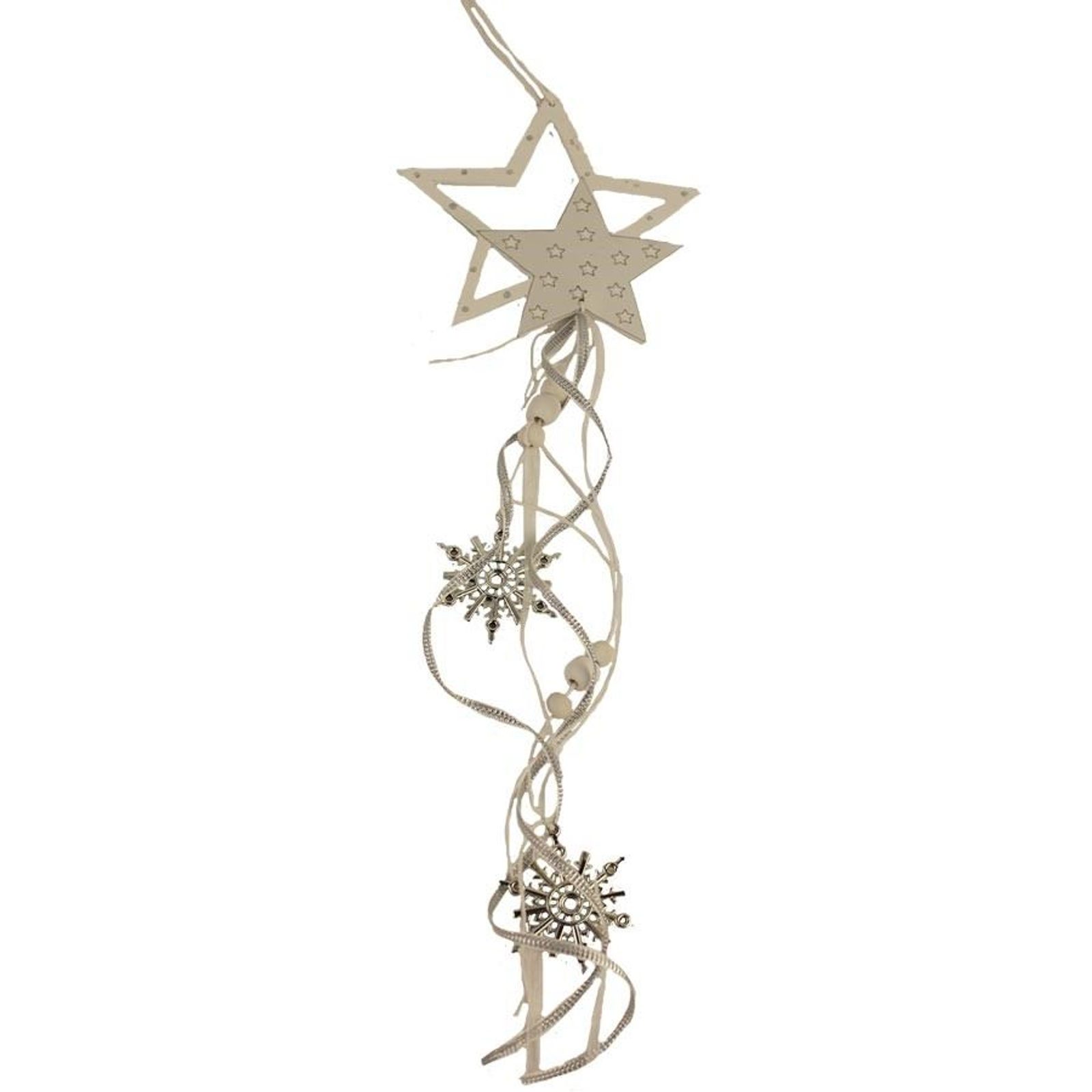 Dekorační hvězda k zavěšení. Dekorace má rozměry 12 x 11,5 cm, tloušťka 0,3 cm, celková délka dekorace 60 cm. Barva : kombinace bílá se stříbrnou. Materiál na bázi dřeva, kov.