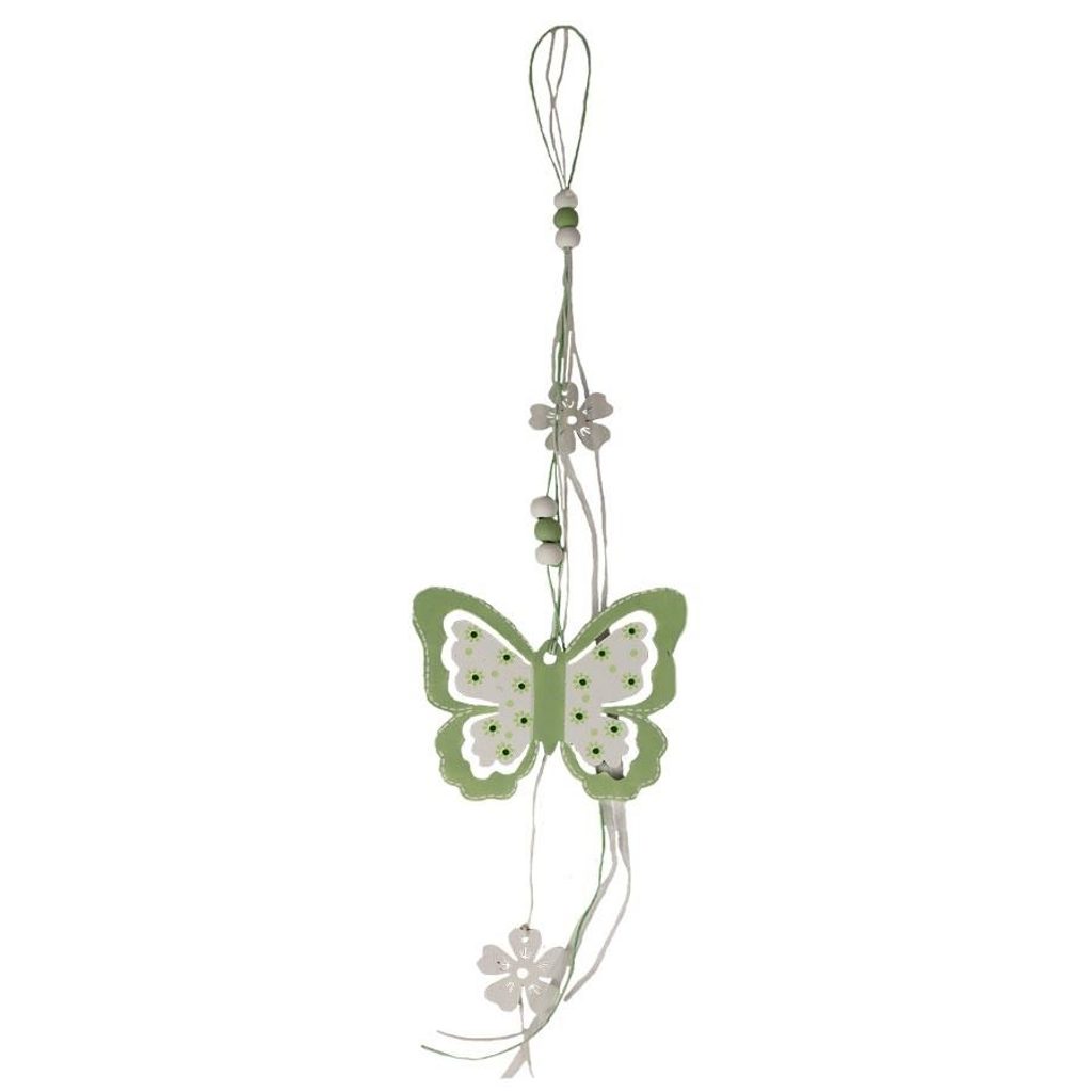 Dekorační motýl k zavěšení. Rozměry : 12 x 0,4 cm, celková délka 55 cm. Barva : kombinace zelená s bílou. Materiál na bázi dřeva.