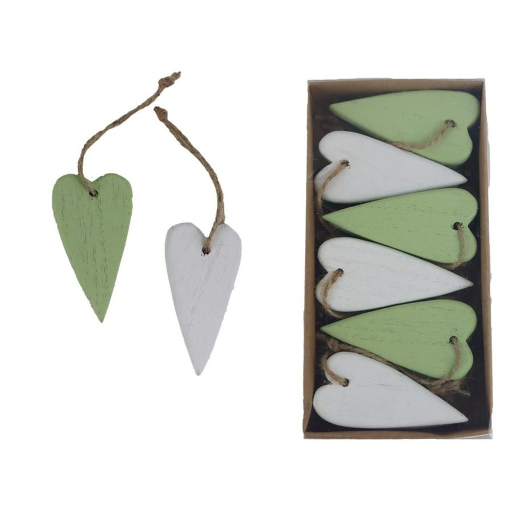 Sada dekoračních srdíček k zavěšení. Sada obsahuje 12 srdíček. Rozměry : 3 x 8 cm, tloušťka 0,7 cm. Barva : kombinace bílá, zelená. Materiál na bázi dřeva.