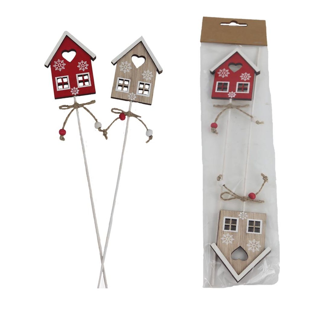 Sada dekoračních zípichů domeček. Sada obsahuje 2 zápichy. Rozměry : 6 x 0,7 cm, výška 8 cm, celková délka zápichu 32 cm. Barva : kombinace přírodní, červená, bílá.. Materiál na bázi dřeva.