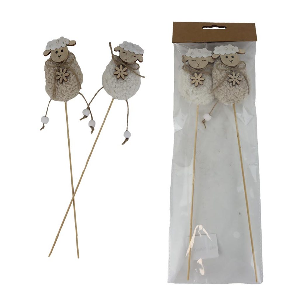 Sada dekoračních zápichů ovečka. Sada obsahuje 2 zápichy. Zápich má rozměry : 6 x 3 cm, výšku 9 cm, celková délka zápichu 32 cm.- Rozměr: 6×2×31.5