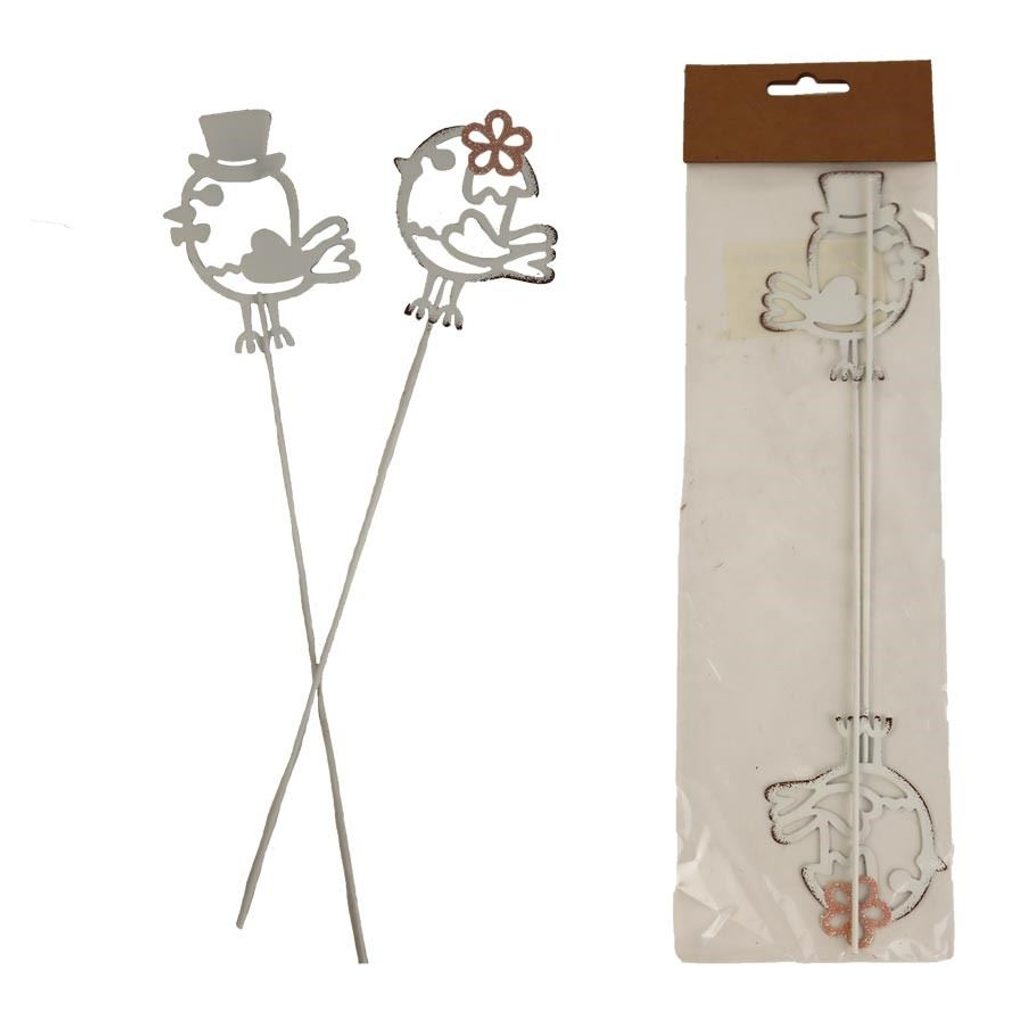 Sada dekoračních zápichů - ptáček. Sada obsahuje 2 zápichy. Rozměry : 6,2 x 0,3 cm, výška 8 cm, celková délka zápichu 27,5 cm. Barva : bílá. Materiál : kov.