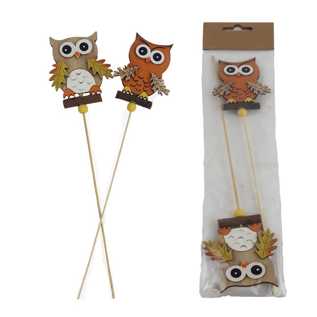 Sada dekoračních zápichů sova. Sada obsahuje 2 zápichy. Rozměry : 7 x 0,6 cm, výška 9,5 cm, celková délka zápichu 31 cm. Barva : kombinace oranžová, přírodní, bílá. Materiál na bázi dřeva.