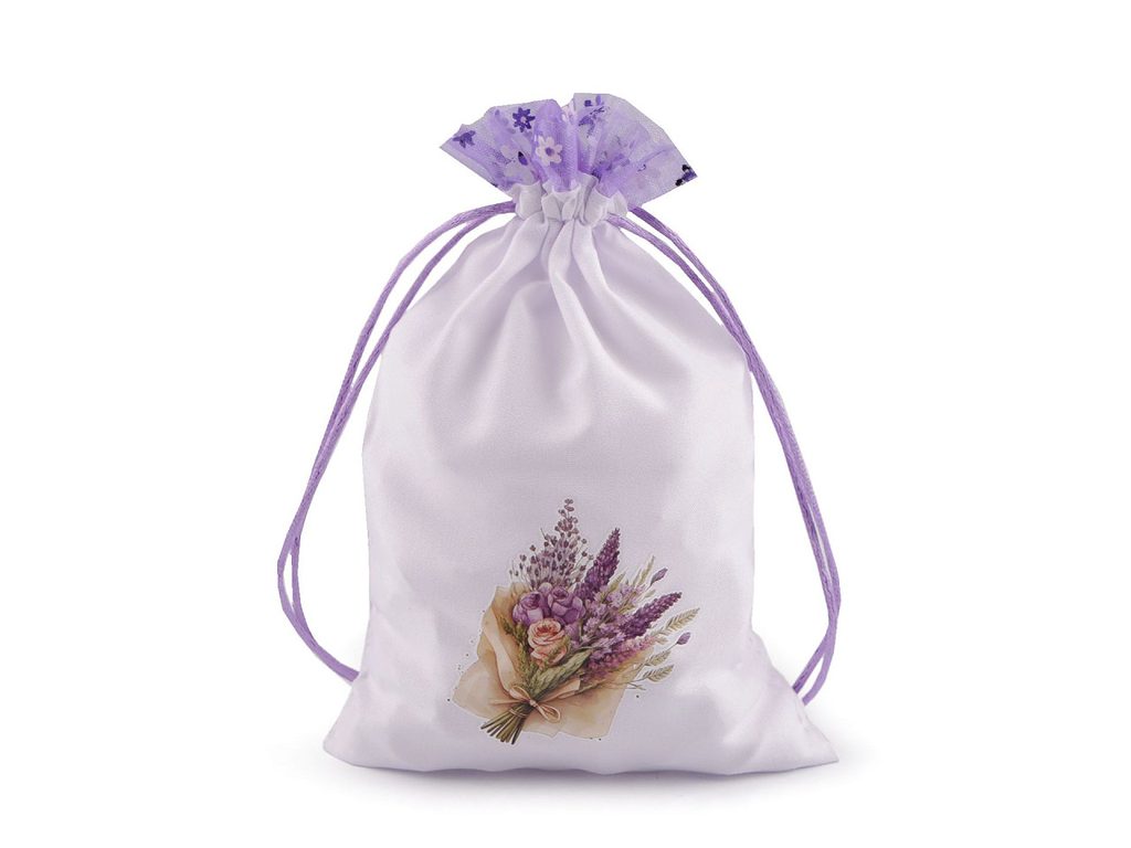 Plátěný dárkový pytlík je na přední straně ozdobený potiskem luční kytice. Plátno je jemné, velice příjemné na dotek. Nahoře je pytlík olemovaný organzou s potiskem květů. Snadno se uzavírá pomocí dvou stahovacích saténových šňůrek.Pytlík působí luxusně, můžete do něj zabalit dárky, uschovat vaše osobní poklady nebo naaranžovat voňavé sušené květy.