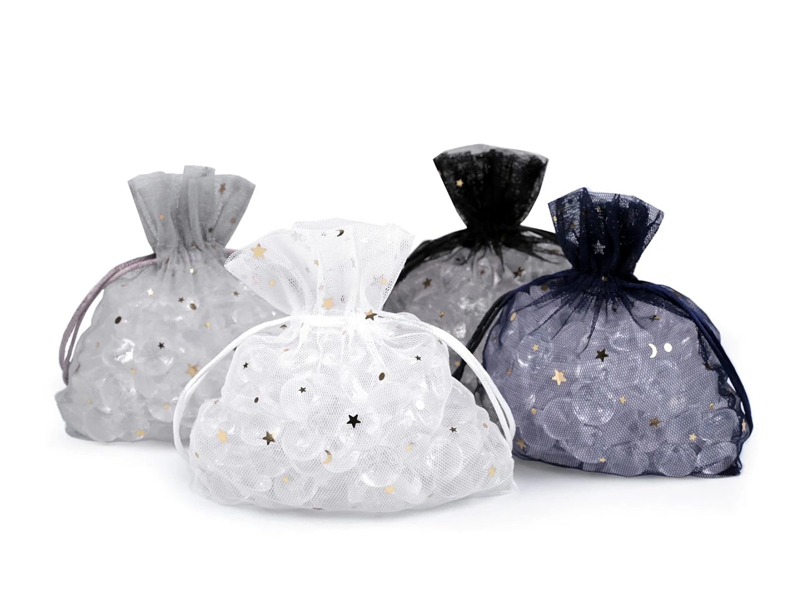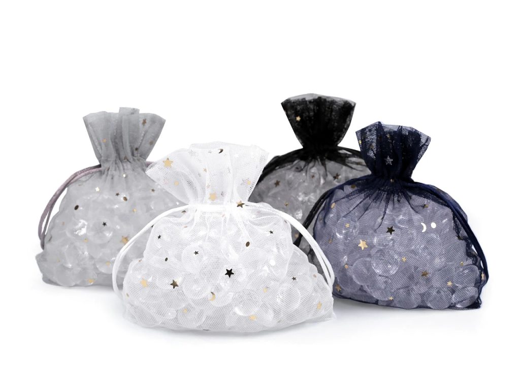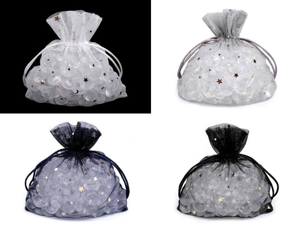 Dárkový pytlík je vyrobený z tylu. Je ozdobený lesklým metalickým potiskem hvězdiček. Snadno se uzavírá pomocí dvou stahovacích saténových šňůrek.