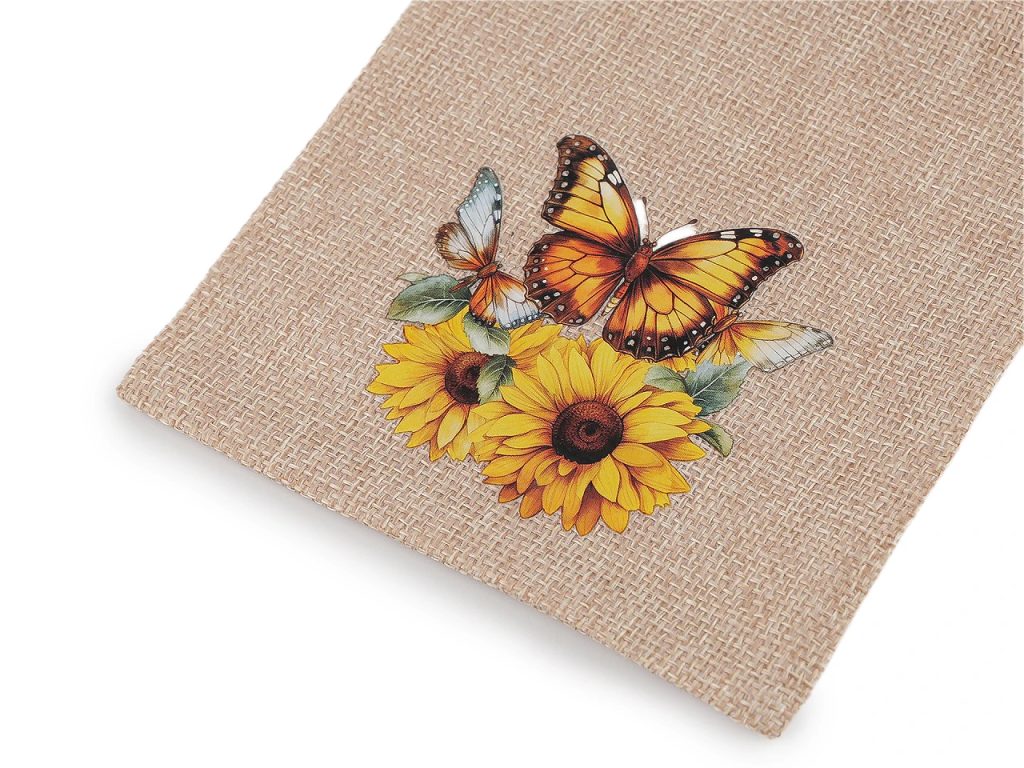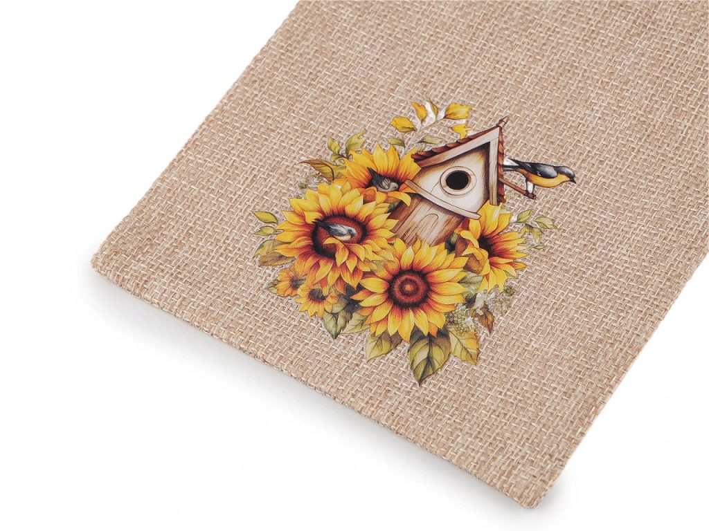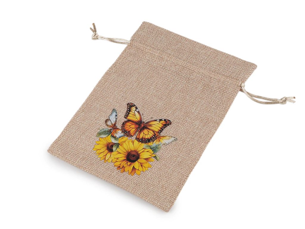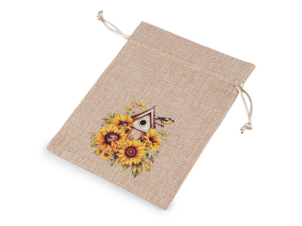 Dárkový pytlík s potiskem slunečnic je skvělý na rychlé zabalení malých dárků. Materiál pytlíku svým zpracováním připomíná jutu. Uzavírá se pomocí stahovacích saténových šňůrek. Potisk je na přední straně pytlíku, je pogumovaný.
