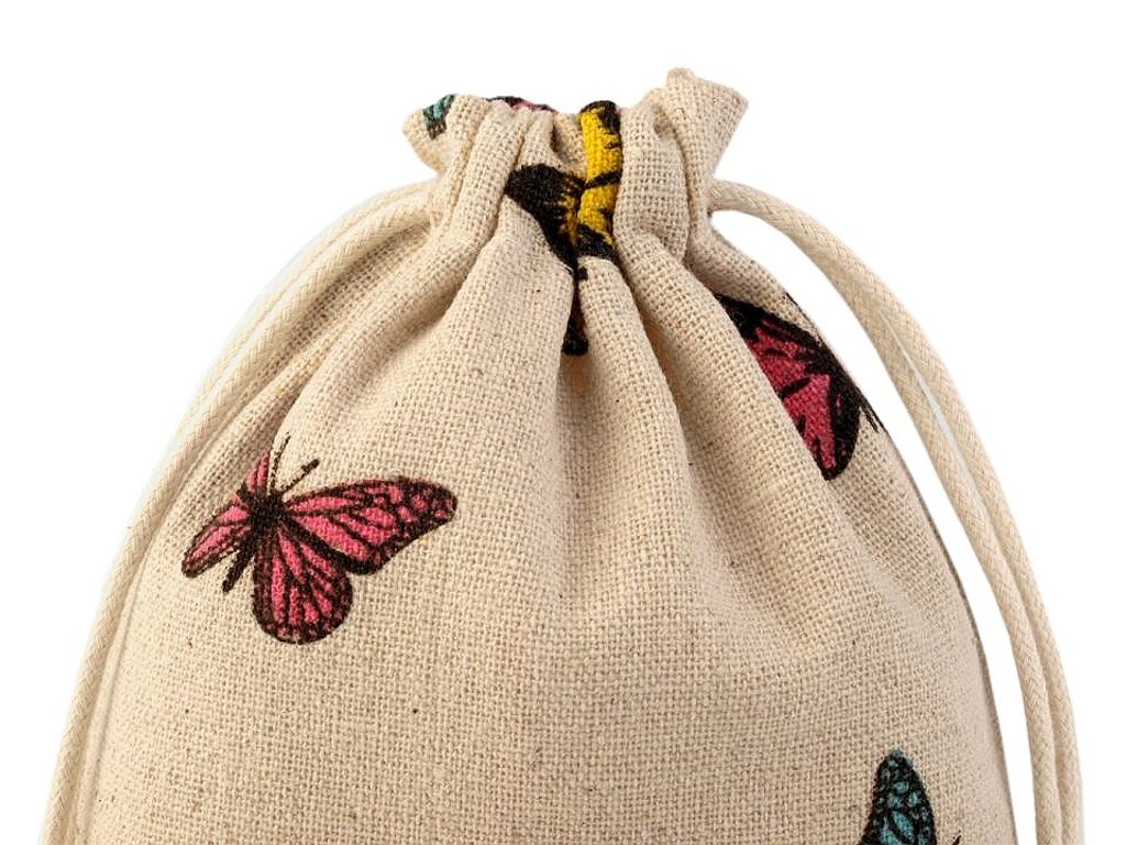 Přírodní lněný pytlík zdobí veselý potisk barevných motýlů. Je kvalitní a pevný. Snadno se uzavírá pomocí dvou bavlněných stahovacích šňůrek.