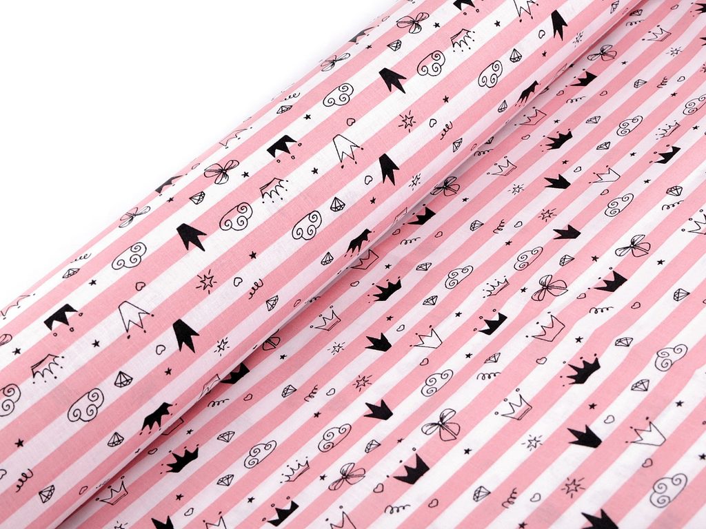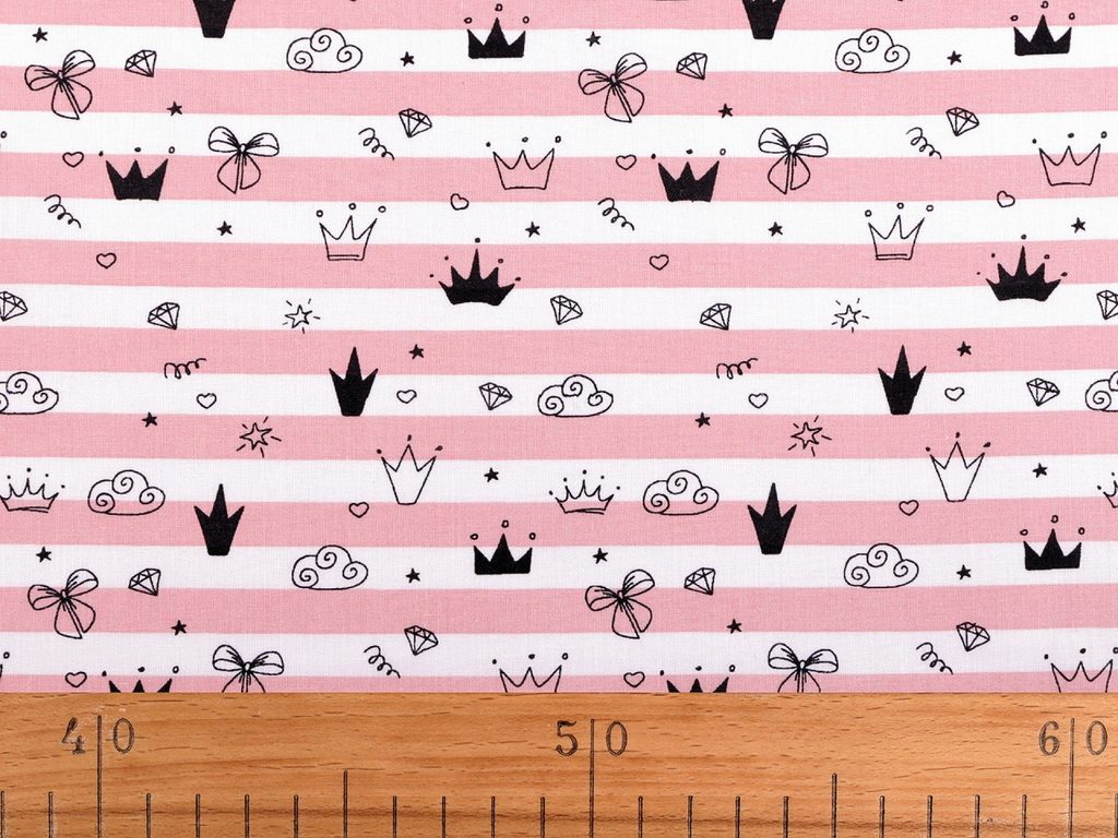 Pruhovanou bavlněnou látku zdobí drobné obrázky korunek, mráčků, hvězd a dalších motivů. Látka je vhodná na šití polštářů, dětského povlečení, závěsů, pytlíků, tašek nebo mantinelů do postýlek.- Šíře:: 140 cm