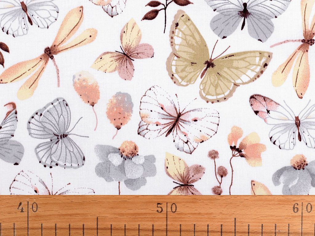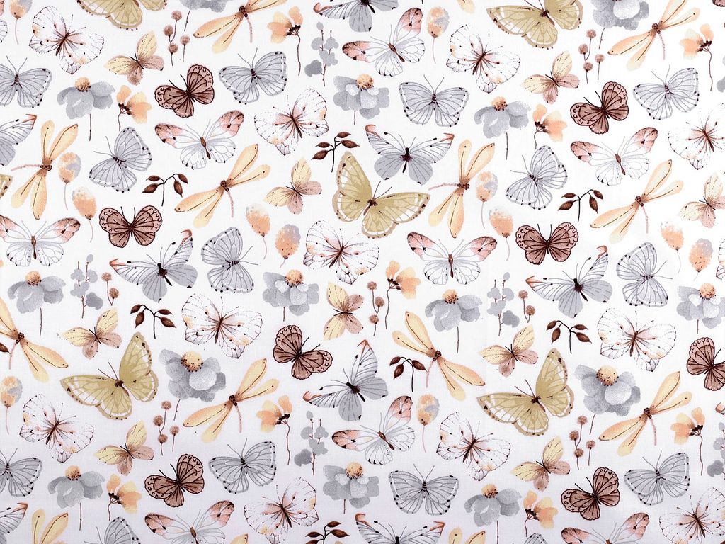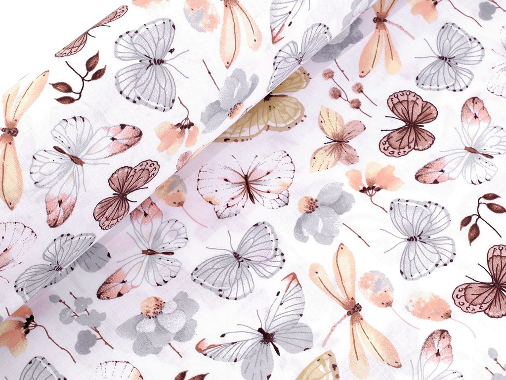 Bavlněné plátno zdobí potisk motýlů. Vynikne na povlečení, ubrusech, polštářích, ale můžete z ní ušít i tašky, pytlíky apod.- Šíře:: 160 cm