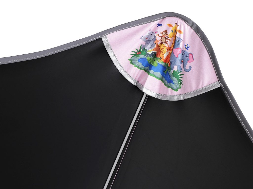 Kvalitní dětský deštník zdobí veselý barevný potah s potiskem. Je celý olemovaný reflexním proužkem. Velmi lehce se otevírá i zavírá, je uzpůsobený pro děti, stačí jen deštník výtáhnout nahoru nebo dolů bez mačkání pojistky. Rukojeť je velikostně přizpůsobená dětské ruce. Konstrukce deštníku je z pevných pružných lamel a tvoří osm polí. Konce lamel jsou bezpečně zašité do vnitřních kapes.Hloubka deštníku je 20 cm.