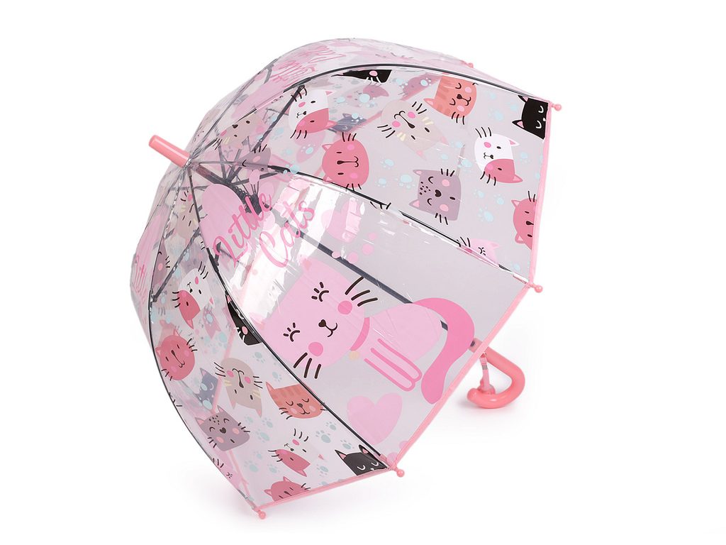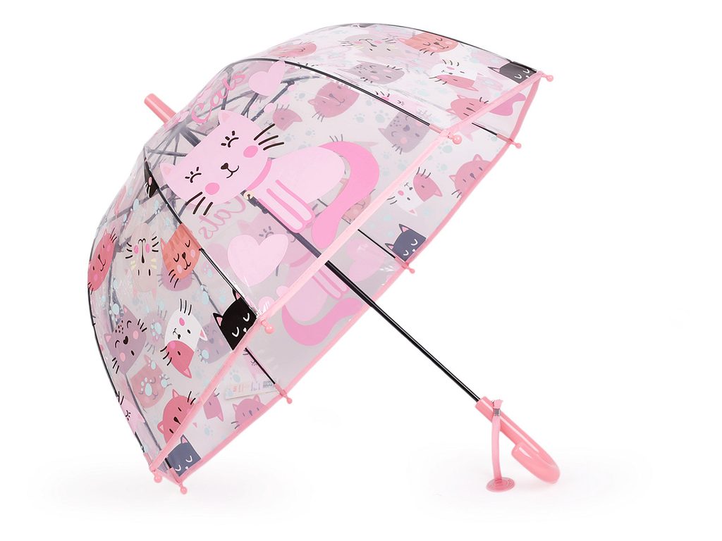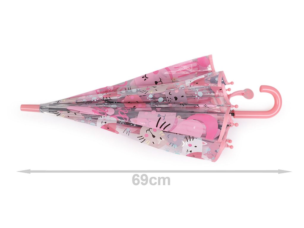 Dětský vystřelovací deštník s potiskem koček děti nadchne, protože díky průhlednému potahu uvidí ven. Navíc je dost hluboký, budou mít pocit, že jsou celí schovaní. Na rukojeti má visačku, na kterou můžete napsat jméno dítěte. Deštník je vystřelovací, má klasickou tyč zakončenou pevnou rukojetí. Konstrukce deštníku je z pružných lamel a tvoří osm polí.Konce lamel jsou zakončené plastovými kuličkami - zmenšují riziko poranění. Deštník má klasické zapínání na patentku.