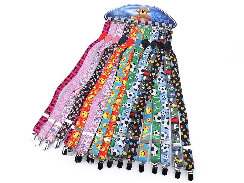 Dětské šle o délce 60 cm a šířce 2,5 cm s různými potisky. Popruhy jsou různě barevné. Natištěné motivy jsou kvalitní, neloupou se ani neodírají. Šle jsou vyrobeny ze 100% polyesteru. Originální balení obsahuje 10 ks šlí v náhodném barevném mixu. Jedná se o kvalitní výrobek české výroby, šle se přichycují pomocí kovových žabek.