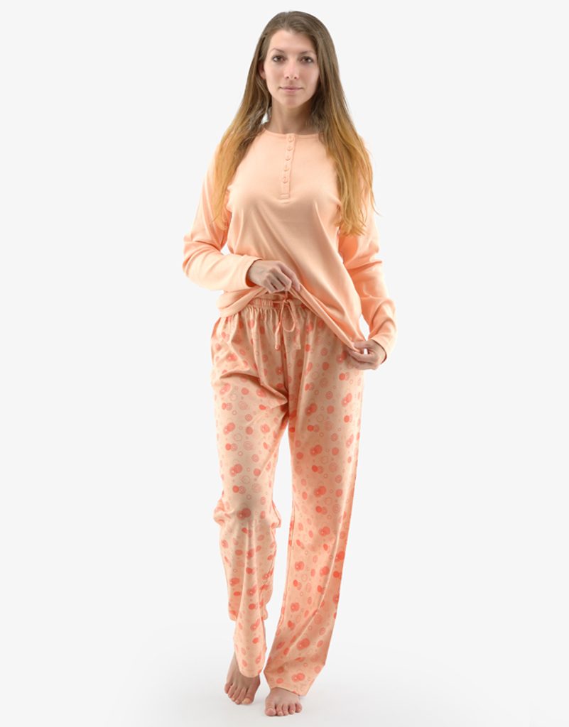 pyžamo dlouhé dámské, šité, s potiskem značky GINA, kód 19143. Složení: 95% bavlna, 5% elastanZákladem kvalitního spánku je vaše pohodlí, ke kterému vám pomůže i pohodlné noční prádlo. Naše dámské pyžamo s dlouhým rukávem a dlouhými volnými kalhotami potěší každou milovnici pohodlí, protože je celé ušito z bavlněného úpletu doplněného o elastan. Neztratí se vám ani jako domácí oblečení, jelikož je vhodné pro každodenní nošení.. Kolekce: Pyžama 2022