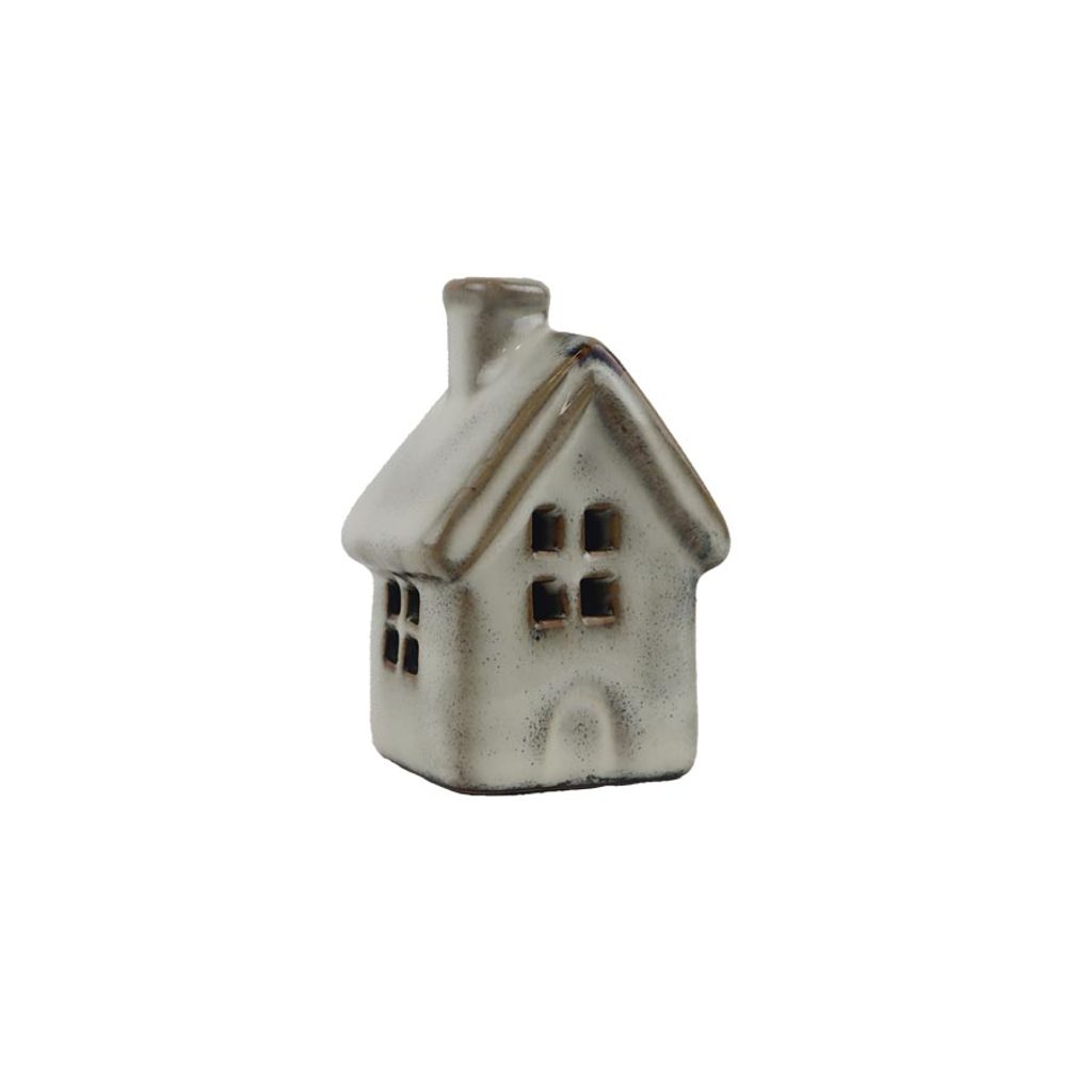 Dekorační domeček. Rozměry : 4,5 × 3,5 cm, výška 7 cm. Barva : kombinace šedá s hnědou. Materiál : keramika.Rozměr: 4,5 × 3,5 × 7 cm