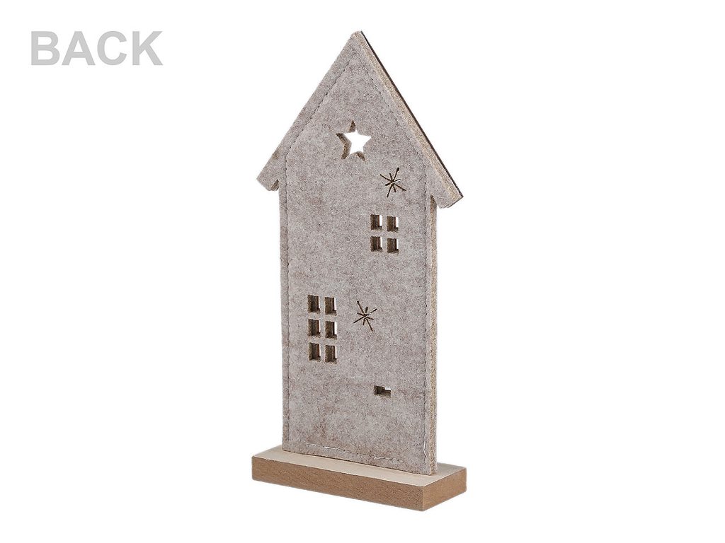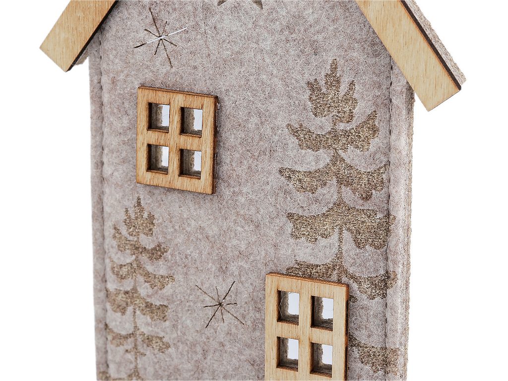 Dekorační domeček má základ z pevného filcu a střechu, podstavec a detaily ze dřeva. Přední stranu zdobí motiv lesa s jelenem a výřezy hvězd. Zútulní každý interiér. Domeček je ideální pro různé sezónní a sváteční období, zvláště pak jako stylová vánoční dekorace. Můžete ho umístit na krbovou římsu, okenní parapet, poličku nebo vynikne jako součást větší dekorativní kompozice na stole.