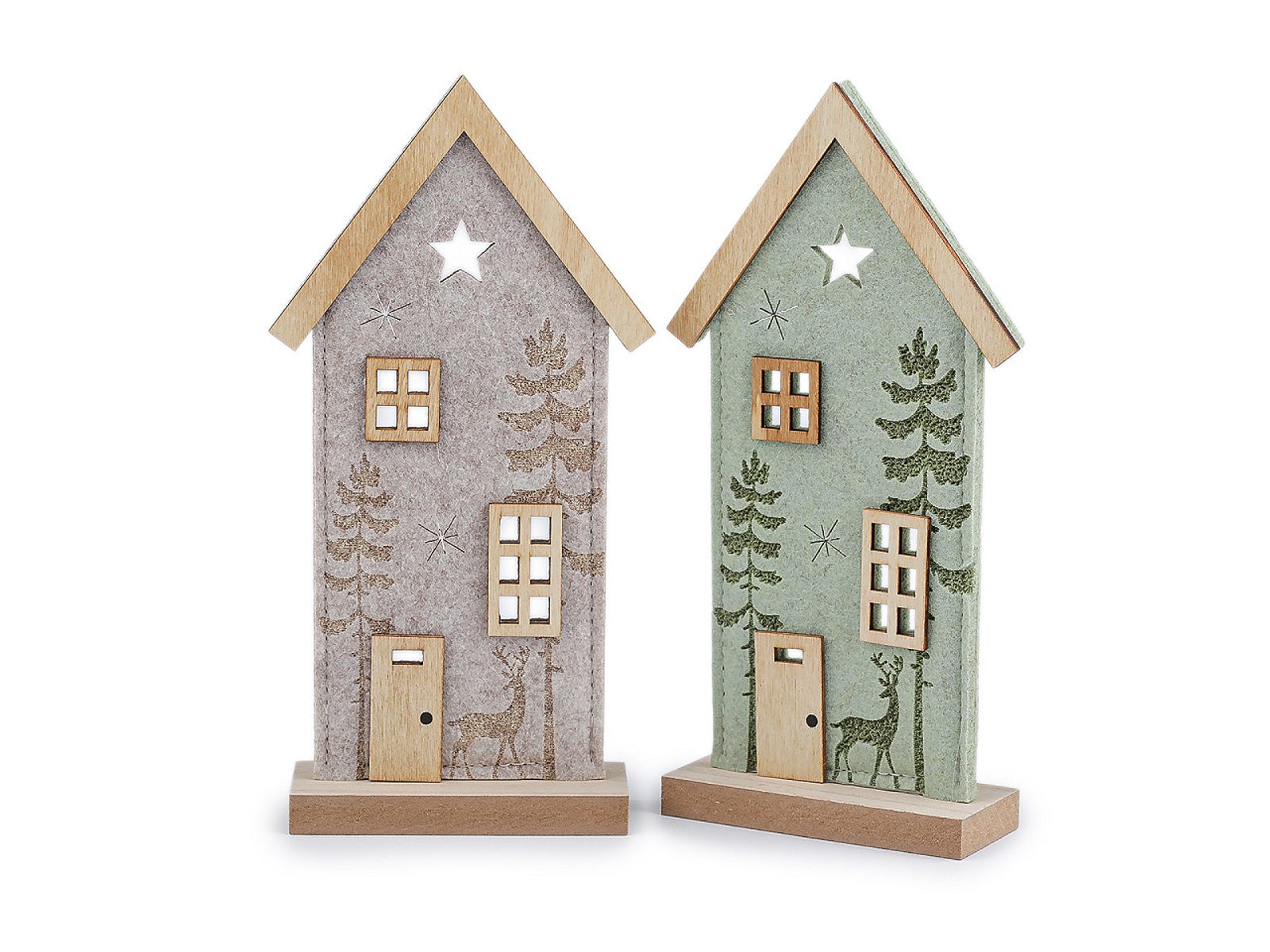 Dekorační domeček má základ z pevného filcu a střechu, podstavec a detaily ze dřeva. Přední stranu zdobí motiv lesa s jelenem a výřezy hvězd. Zútulní…