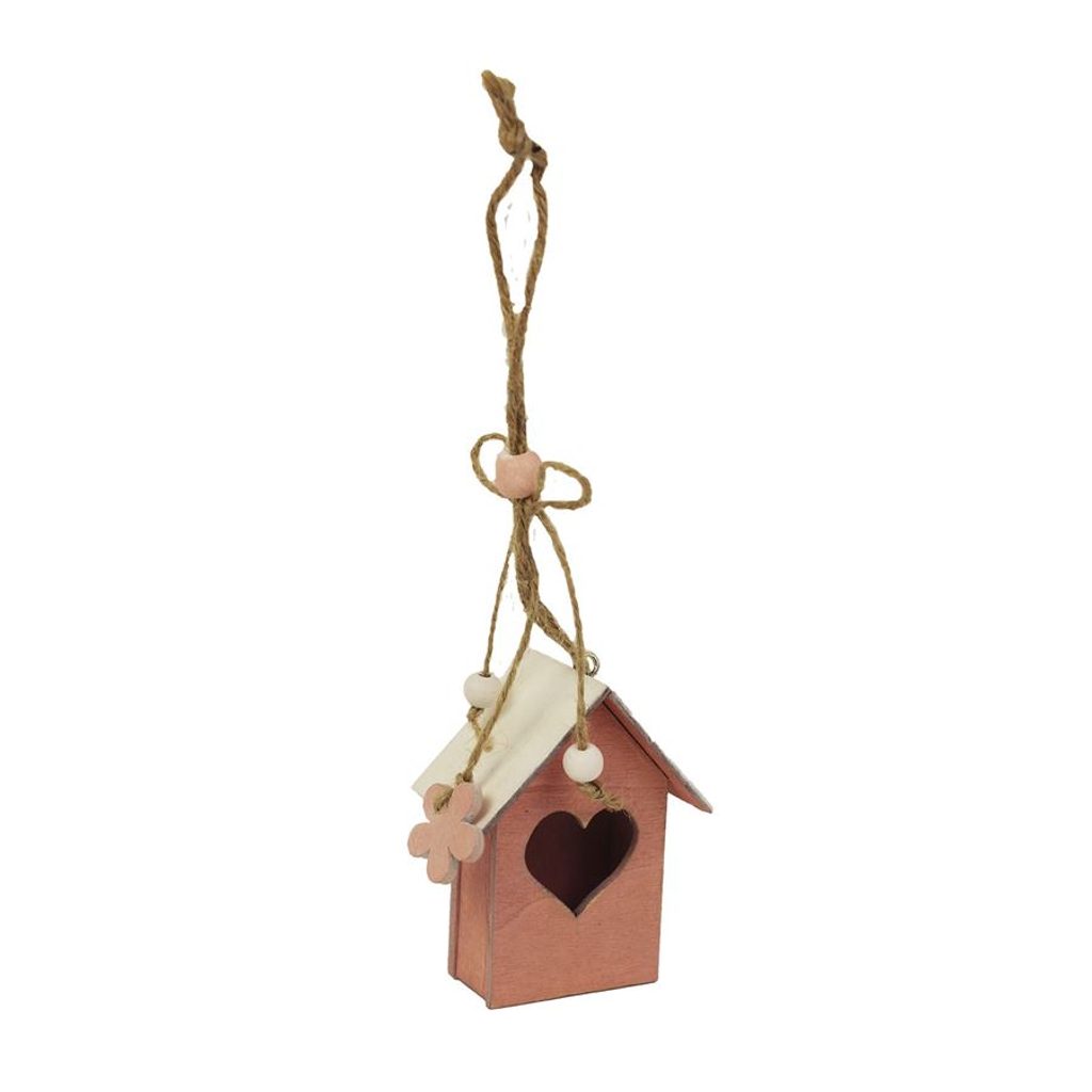 Dekorační budka k zavěšení. Rozměry : 5,2 x 3,5 cm, výška 7 cm. Barva : růžová. Materiál na bázi dřeva.Rozměr: 5,2 x 3,5 x 7 cm