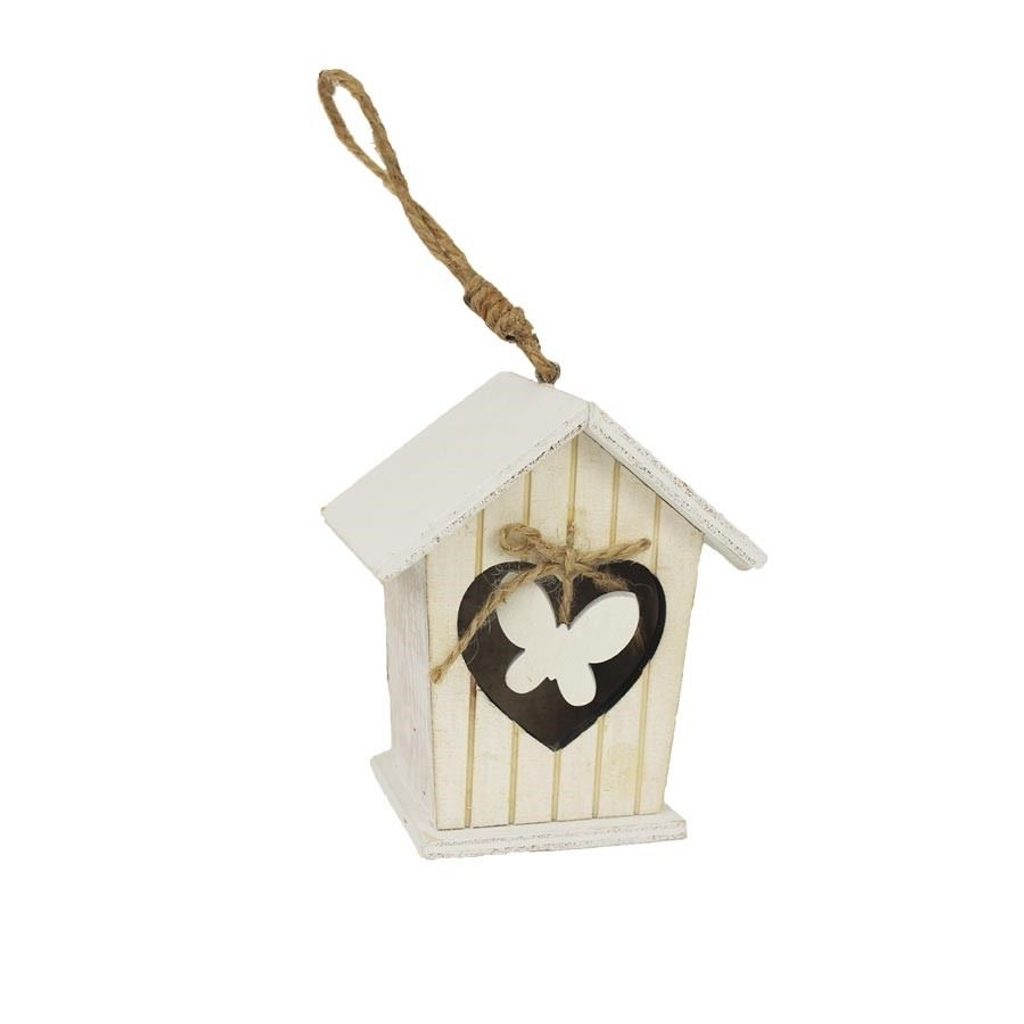 Dekorační budka k zavěšení. Rozměry : 9,6 x 6,5 cm, výška 11 cm, celková délka dekorace 22 cm. Barva : kombinace hnědá s bílou. Materiál na bázi dřeva.