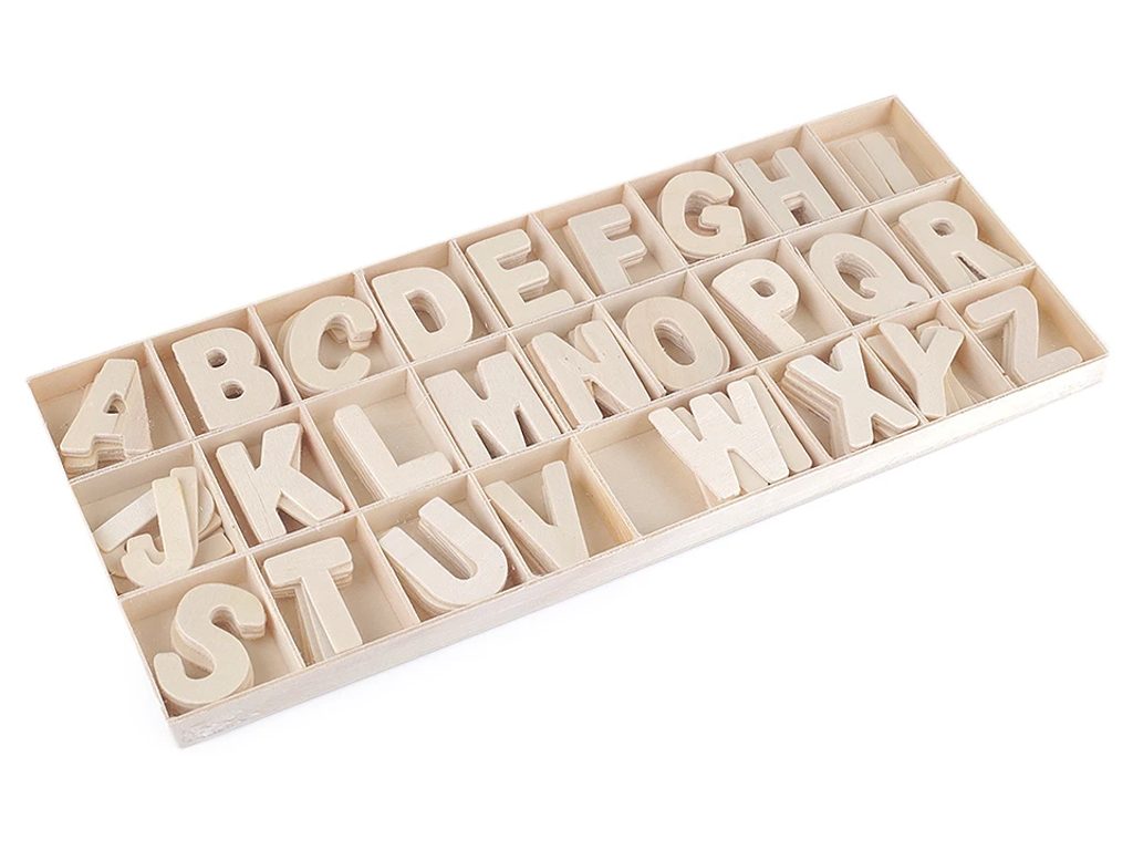 Dřevěná písmena v krabici zobrazují celou abecedu. Je oblíbená maminkami prvňáčků, s úspěchem ji používají jako zábavnou učební pomůcku. Hodí se k nalepení na přání, můžete s nimi ozdobit dveře dětského pokoje apod. Z rubu nemají samolepku, k přichycení můžete použít oboustrannou lepicí pásku nebo tekuté lepidlo. Abeceda i krabice je vyrobená z překližky, můžete je dále upravovat lakováním, mořením apod. Písmenka jsou uložená v jednotlivých přihrádkách po 5 ks. Celkem je v krabici 130 písmen. Celá sada je vhodná na vystavení v prodejnách, písmenka jsou oblíbeným upomínkovým dárkem. Dekorace mohou sloužit jako polotovar při výtvarných technikách decoupage, scrapbooking apod. Tloušťka písmenek je 1,8 mm. Tloušťka překližky na krabici je 3 mm.