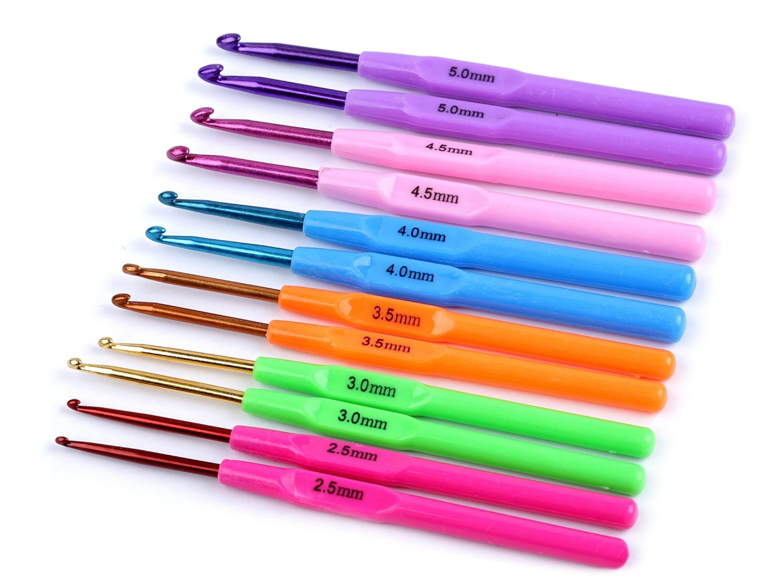 Sadu háčků na háčkování ocení každý, kdo rád a často háčkuje.Sada obsahuje velikosti háčků 2,5; 3; 3,5; 4; 4,5; 5 - všechny velikosti jsou v párech, tudíž celkem je v sadě 12 háčků.