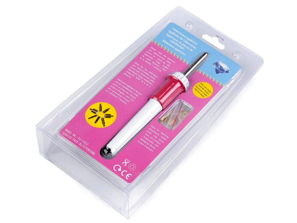 Hot fix aplikátor vám pomůže do pěti vteřin docílit lesk a třpyt na vašich oděvech! Hot fix aplikátor je neocenitelná pomůcka při lepení hotfixů, neboli nažehlovacích kamínků či šatonových růží. Hot fix jednoduše vložíme do nástavce, lepidlo na konci flitru se roztaví, přiložíme k látce a lehce přitlačíme. Nahřívání nástavce trvá cca 2 minuty. Můžeme takto jednoduše vytvářet nádherné ozdoby a vzory na látce, riflích nebo taškách.Dodáváme v kompletu se 7 nástavci ( vel. ss6 / 2 mm, ss10 / 3 mm, ss16 / 4 mm, ss20 / 5 mm, ss34 / 7 mm - pro vypouklé hotfixy, vel. 5 a 9 mm pro rovné hotfixy) a stojánkem. Doporučujeme vyzkoušet na malém kousku látky! Nástavec dosahuje vysokých teplot, takže aby nedošlo k poškození látky, pokud by byla z umělého materiálu!