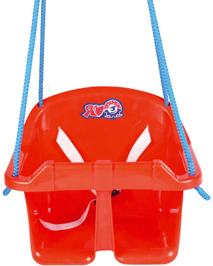 Barevná bezpečná houpačka z plastu, na zavěšení, vhodná pro nejmenší děti, v červené barvě.Tato dětská houpačka je vyrobena z pevného a odolného plastu. Houpačka pro děti visí na pevném laně a dítě je při houpání jištěno hrazdou, kterou mají před sebou. Houpačka má zadní opěradlo, popruhy pro