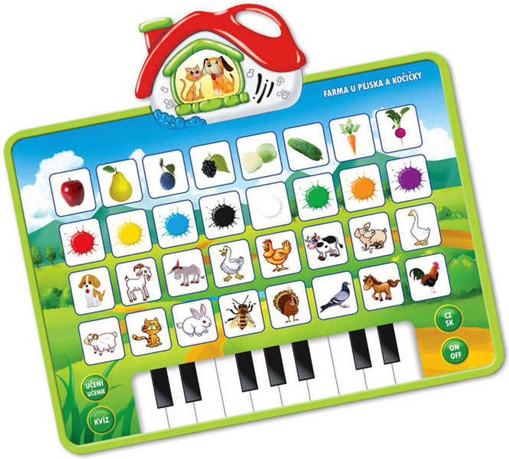 Zavítej na farmu pejska a kočičky a užij si spoustu zábavy! Skvělá dotyková podložka se světlem a zvukem tě seznámí se zvířátky, s různými druhy ovoce a zeleniny. Naučí tě, jaké zvuky vydávají zvířátka nebo jakou barvu má mrkvička. Předvěď své hudební umění na piánku a zahraj své oblíbené písničky. Získané znalosti si můžeš ověřit v jednoduchém kvízu. S farmou pejska a kočičky tě čeká zábava po celý den. Naučné pianko vhodné pro nejmenší děti.Rozměry dětské hračky (v d): 32 x 35cm