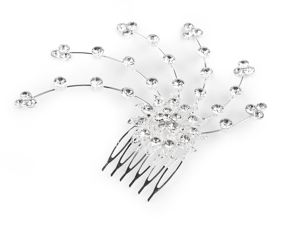 Kovový hřeben do vlasů je ozdobený velkým květem a kaskádou s broušenými kamínky. Je velice poutavý, oslní na každé slavnostní události, třpytí se už z dálky. Je vhodný do společenských účesů i pro nevěsty v jejich den. Hřeben i ozdoba je rovná. V účesu hřeben pevně drží.- Materiál: bižuterní kov s galvanizací, sklo
