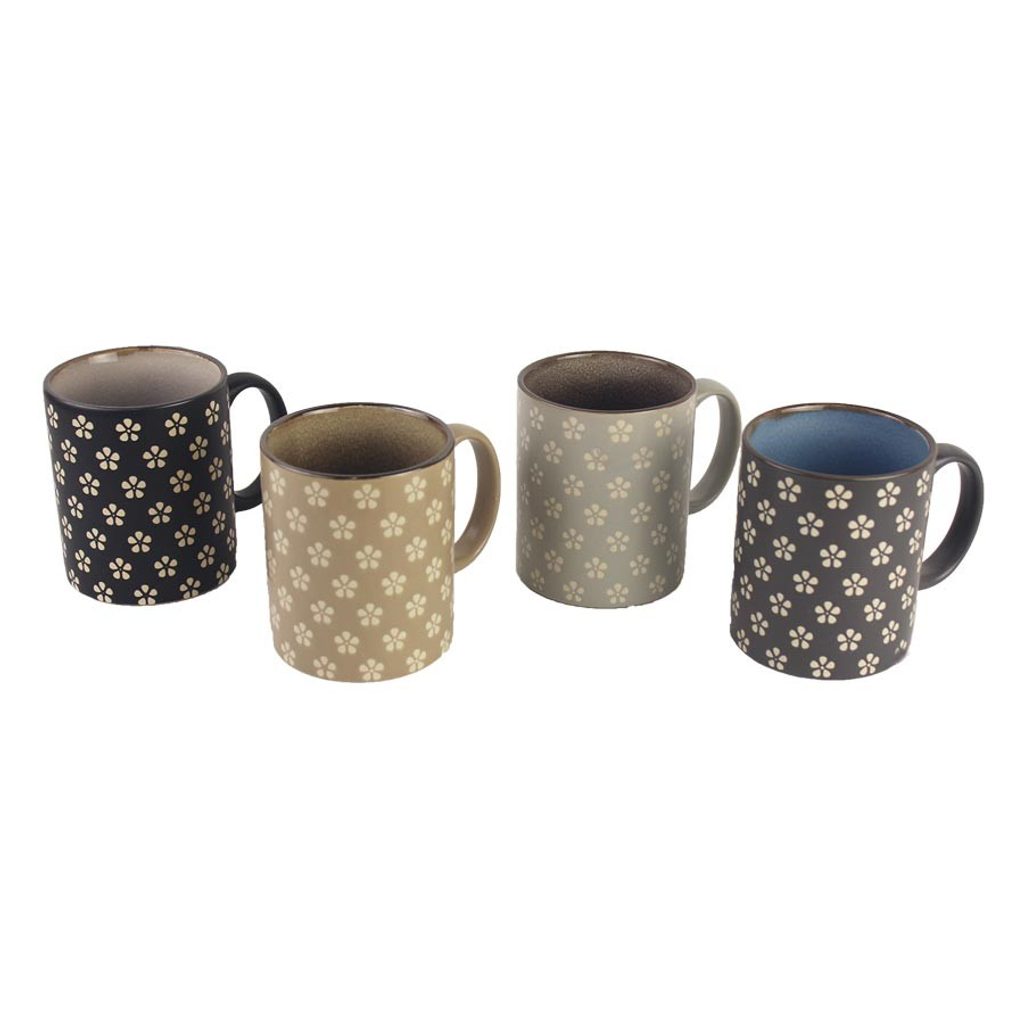 Sada hrníčků s květy. Sada obsahuje 4 hrníčky.. Hrnky mají průměr 8 cm, výšku 9,5 cm. Objem hrnečku 0,35 l. Hrnky jsou vhodné do MVT i do myčky. Barva : šedá, hnědá, černá. Materiál: keramika.