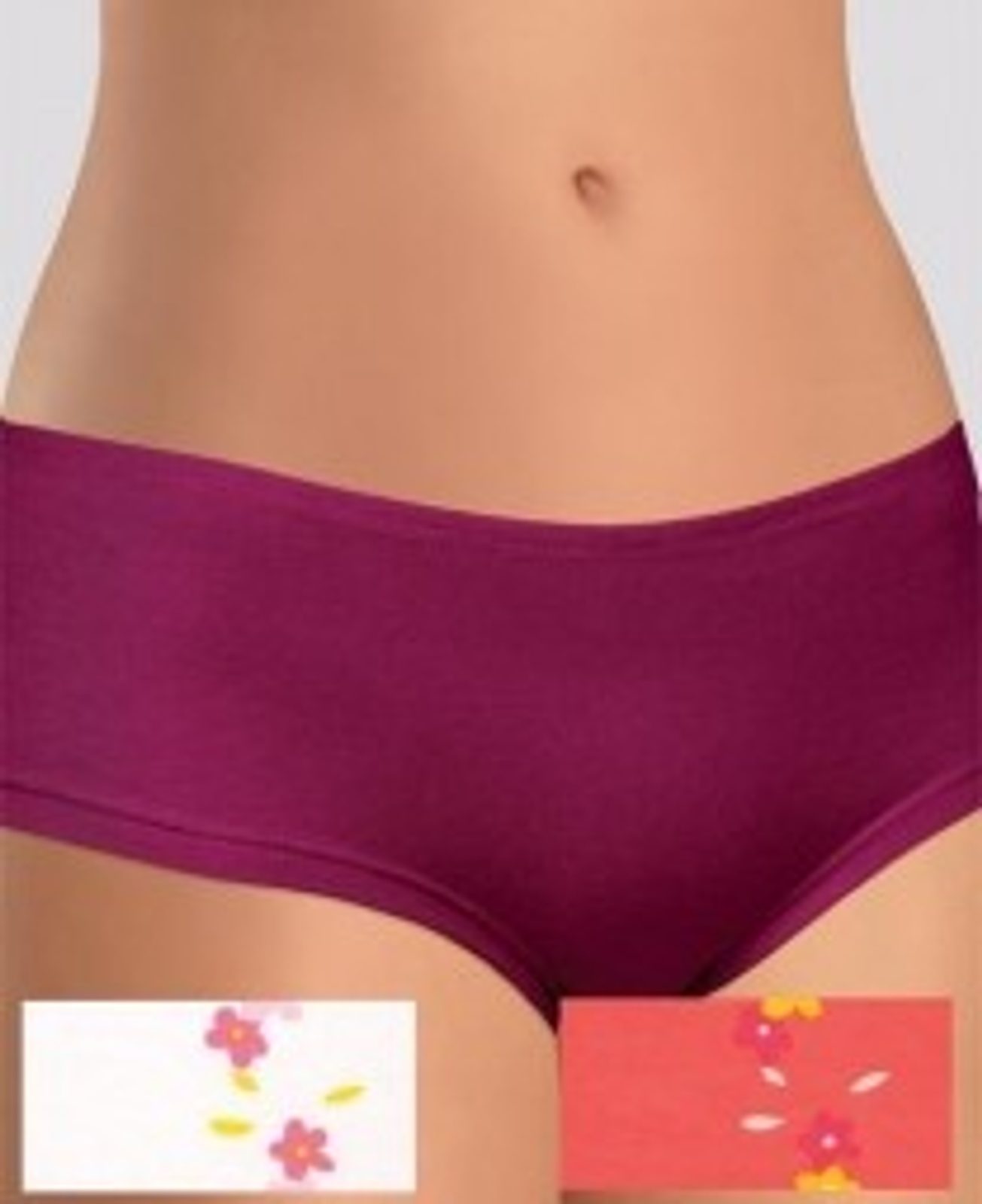 Pohodlné kalhotky s širokými boky. Příjemný bavlněný materiál s přídavkem elastanu pro lepší držení na těle. Na boku jsou kalhotky zdobeny obrázkem květinek.