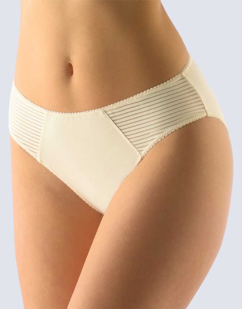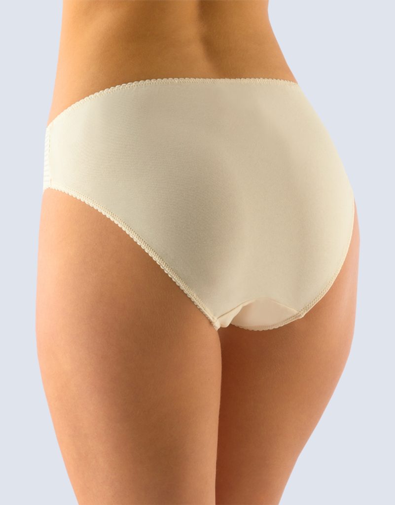 kalhotky klasické, širší bok, šité, jednobarevné značky GINA, kód 10223. Složení: 92% Bavlna 8% ElastanKalhotky klasického střihu, dámské šité prádlo. V pasovém kraji je našitá pruženka s ozdobným krajem. V nohavičkách je našitá pruženka s ozdobným krajem. Kalhotky jsou zdobené pruhovanou vsadkou na bocích. Kalhotky jsou jednobarevné.Materiál je vyroben z bavlny, která je doplněna elastanem. Úplet je vhodný pro všechny, kteří hledají přírodní materiály. Elastan přidává materiálu pružnost a zlepšuje jeho tvarovou stálost. Prádlo z tohoto materiálu je vhodné pro každodenní nošení..- Potisk: ne