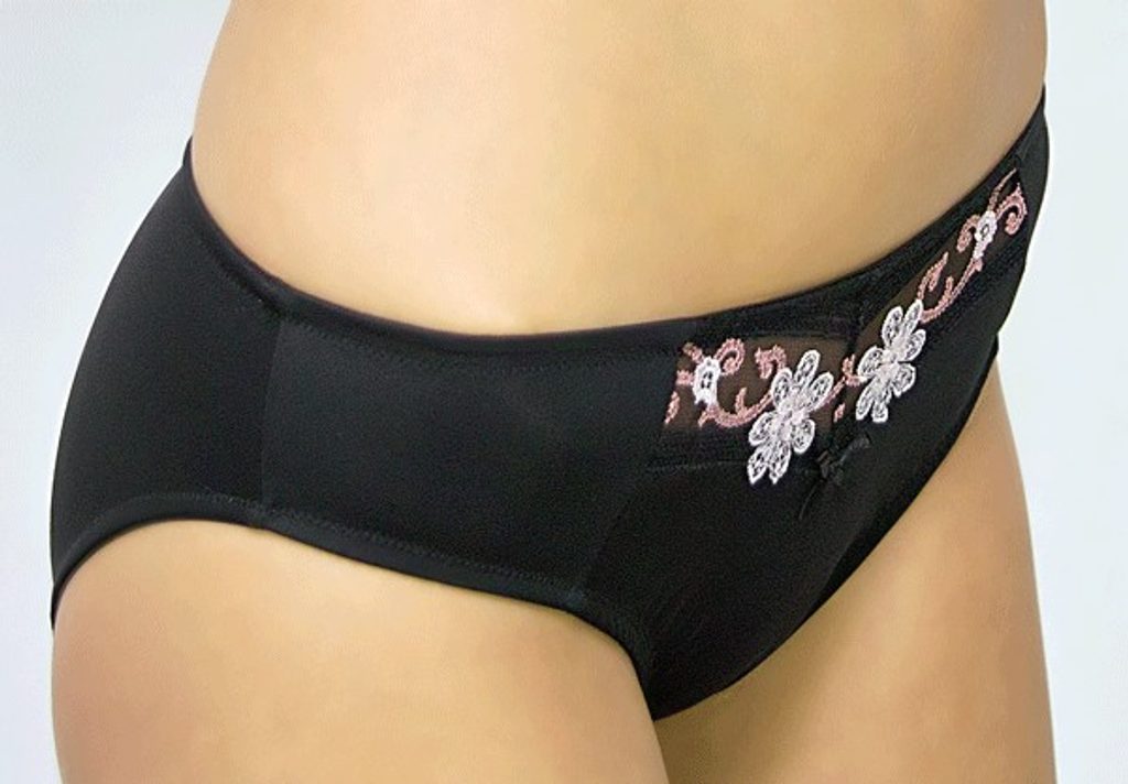 Hezké kalhotky klasického střihu jsou z hladkého černého mikrovlákna na předním díle kombinované krajkou. Na zadním díle je v pase malá vsadka motivu krajkové kytičky. Boky se zvyšují pustupně s velikostí.