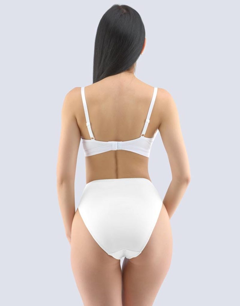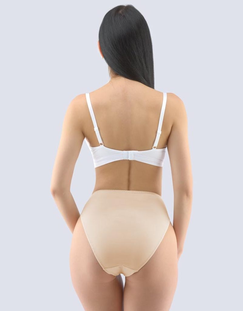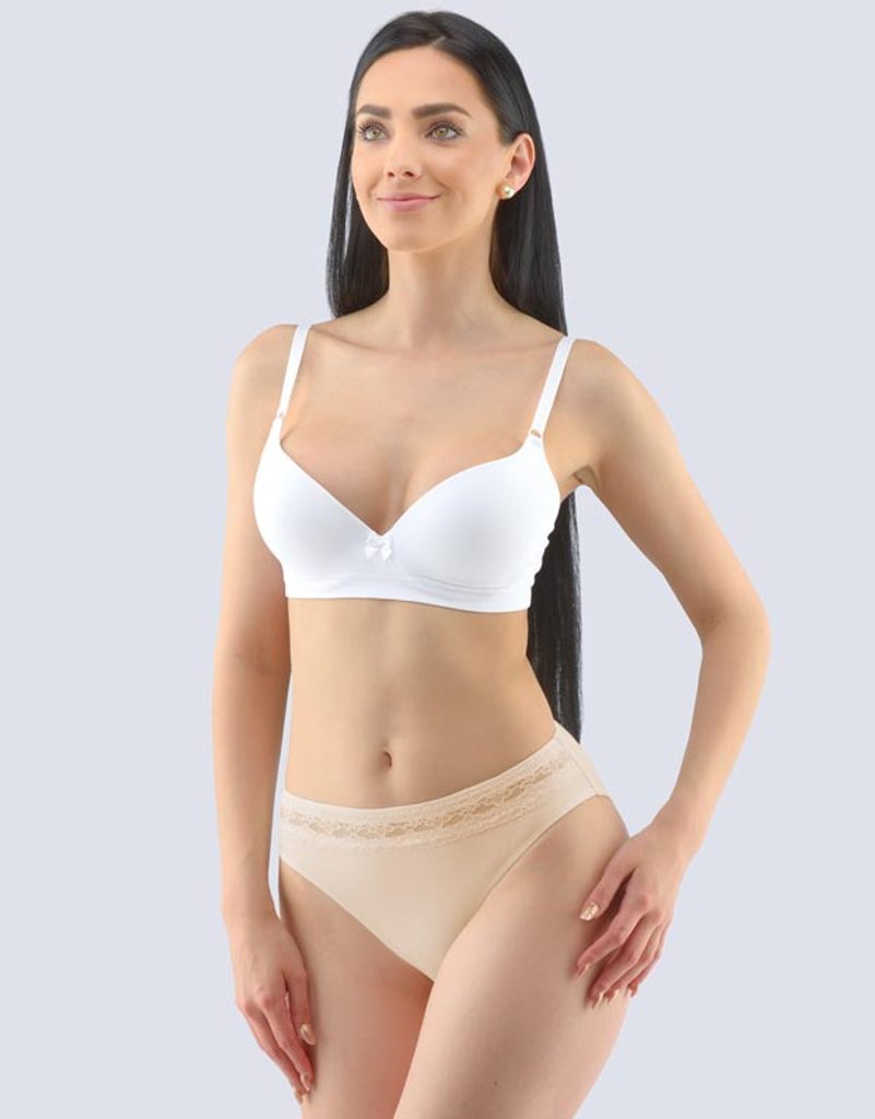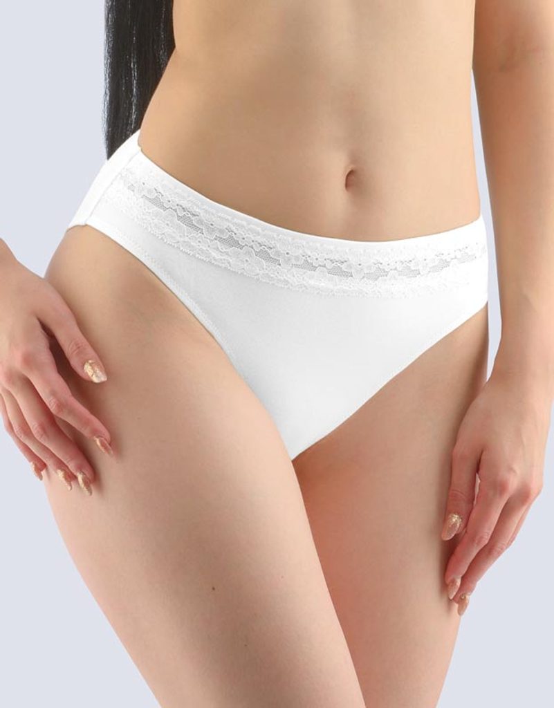 kalhotky klasické, širší bok, šité, s krajkou, jednobarevné značky GINA, kód 10218. Složení: 47,5% Bavlna 47,5% Modal 5% ElastanKalhotky klasického střihu, dámské šité prádlo. V pasovém kraji je zašitá úzká pruženka. V nohavičkách je zašitá úzká pruženka. Kalhotky jsou zdobeny krajkou vsazenou na předním díle. Kalhotky jsou jednobarevné.Materiál je vyroben z modalového vlákna, které je doplněno bavlnou a elastanem. Úplet je vhodný pro všechny, kteří hledají přírodní materiály. Elastan přidává materiálu pružnost a zlepšuje jeho tvarovou stálost. Prádlo z tohoto materiálu je vhodné pro každodenní nošení..- Potisk: ne