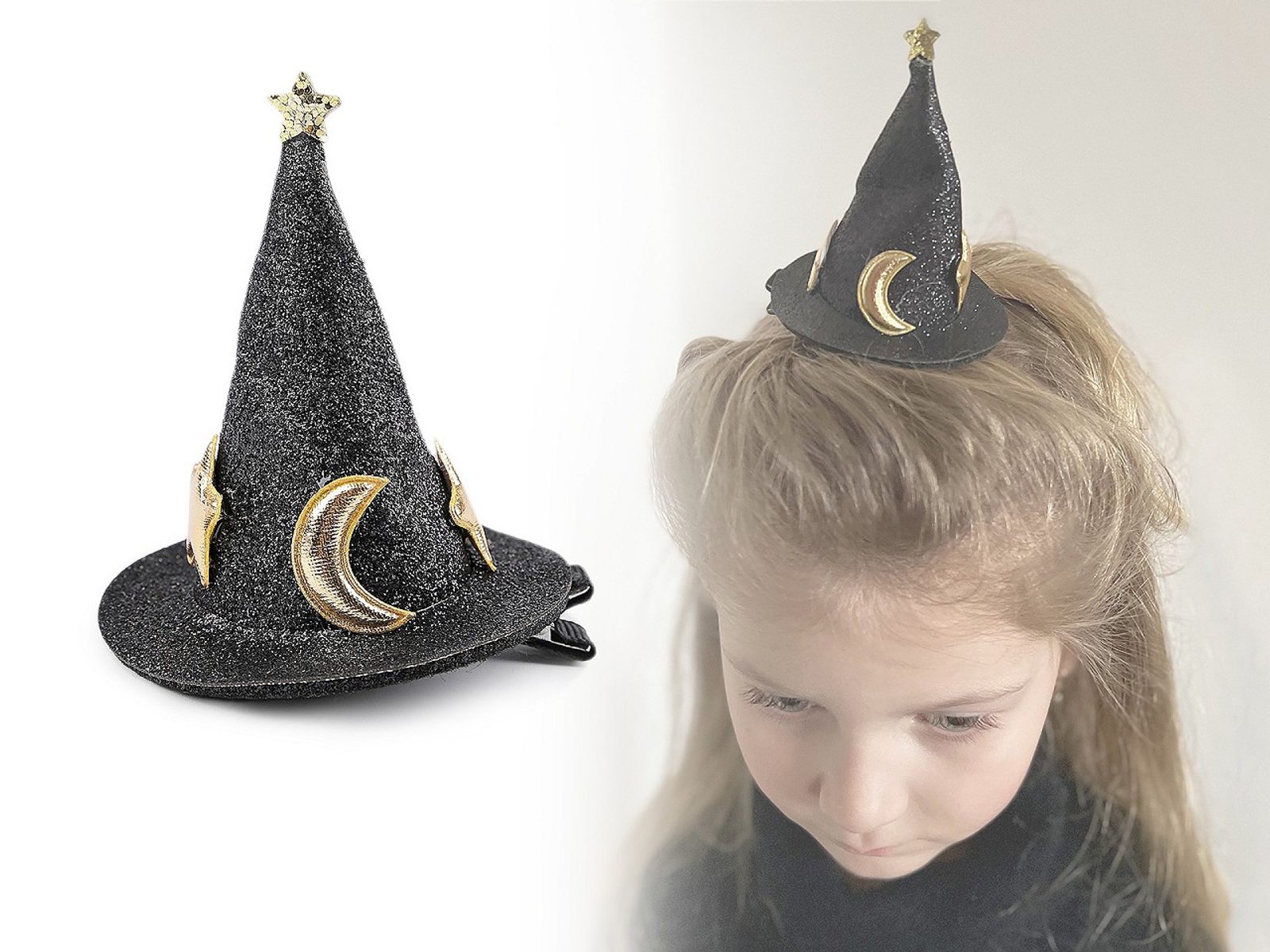 Spona s čarodějnickým kloboukem potěší malé i velké kouzelnice. Klobouk se díky glitrům jemně třpytí. Spona má zoubky, v účesu perfektně drží. Nemusí…