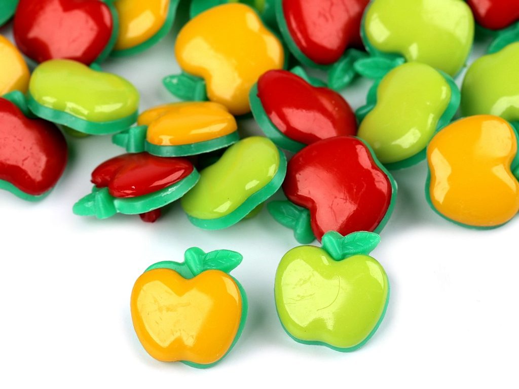 Dětské knoflíky ve tvaru jablka ozdobí oděvy i doplňky. Vyniknou na svetrech, mikinách nebo šatičkách.