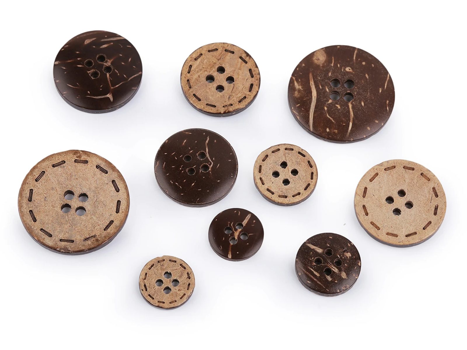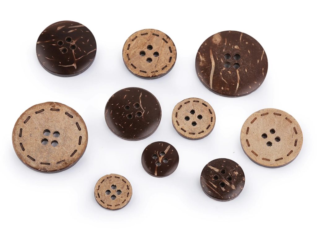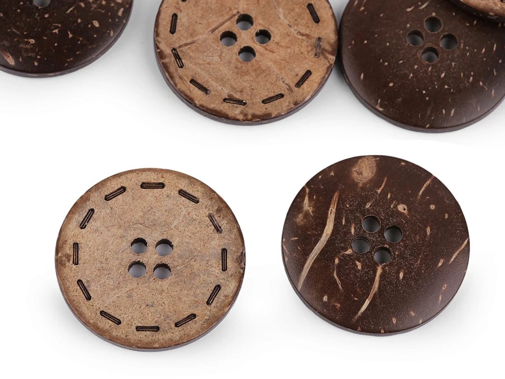 Kokosové knoflíky s reliéfem štepování působí exoticky. Vyniknou na košilích, halenkách, šatech, vestách, kabátech i doplňcích jako jsou tašky a batohy.