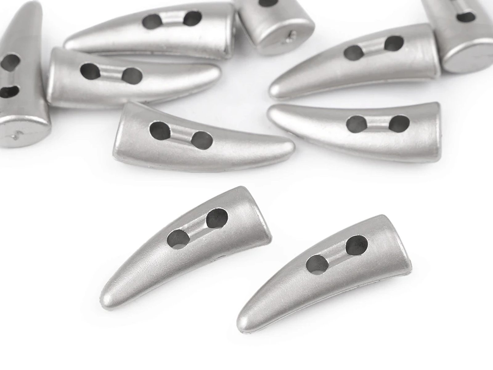 Plastové knoflíky ve tvaru zahnutého rohu využijete na kabáty, vesty, svetry, mikiny, tašky apod. Svým zabarvením připomíná kov.