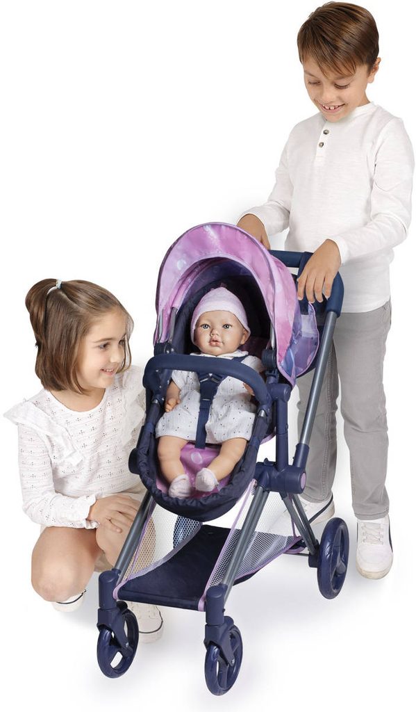 Kočárek je díky vyšší rukojeti a kombinované funkci hlubokého a sportovního kočárku spíš vhodný pro slečny předškolního věku, které toto vše už více při hraní využijí. Obdiv si tento kočárek právem zaslouží za svůj design, který dokonale kopíruje dnešní moderní reálné dětské kočárky celosvětově známých značek jako je třeba Cybex Priam. Výhodou je i odnímatelná přenosná korbička, ve které lze bezpečně přenášet panenku. Po složení nezabírá mnoho místa a je praktický i pro převoz autem. Barevná kolekce Magic Bubble pracuje s něžným duhovým efektem. Od růžové plynule přechází ve světle fialovomodrou, aby v závěru končila královskou modří. Hravé bublinky provázejí celou kolekci. Kulatá závěsná taška na kočárek, jak tvarem, tak designem, podporuje název celé kolekce Magic Bubble. Aplikace tematického Magic Bubble loga výrazně vyniká a zdobí na tmavomodrém pozadí materiálu. Nádherný španělský design, precizní zpracování. Skládací model, velmi snadná manipulace během samotné hry.