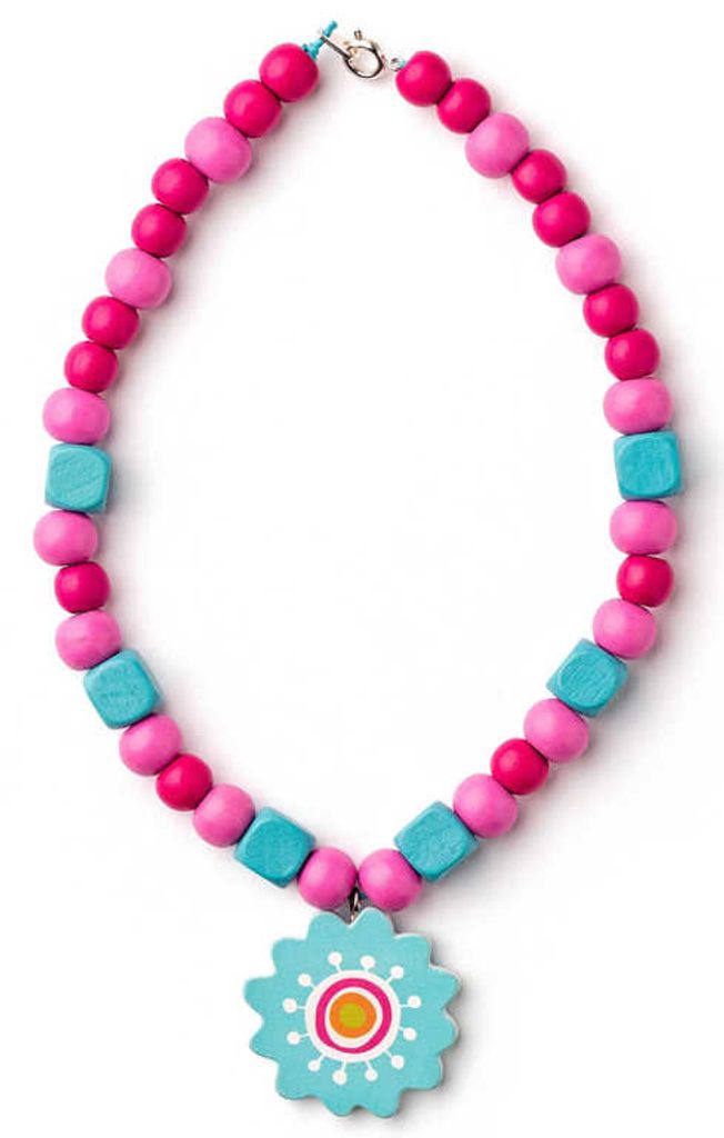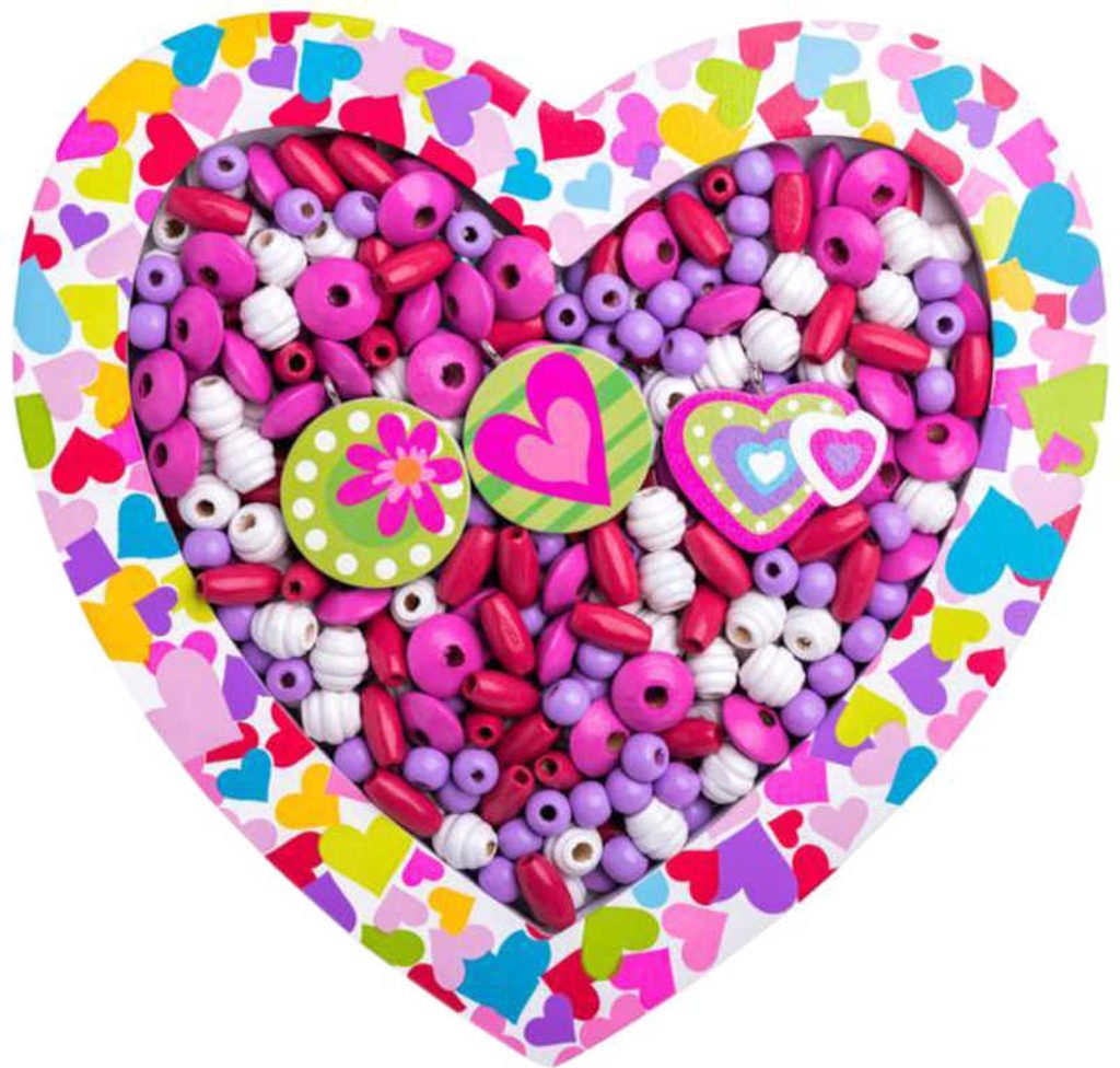 Toto srdíčko obsahuje velké množství klasických i soustružených korálků a přívěsků různých tvarů a velikostí a také tenké tkanice s koncovkou k provlékání, v převážně růžových odstínech. Kreativní sada pro