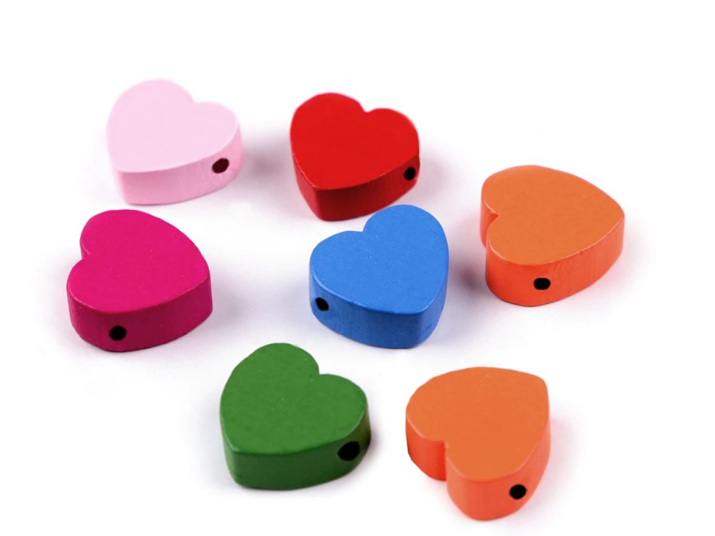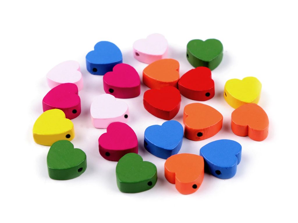 Barevné dřevěné korálky ve tvaru srdce potěší nejen korálkářky, ale i děti. Jejich velikou výhodou je lehký materiál. Dají se skvěle kombinovat s dalšími dřevěnými korálky, s kulatými ale i s dalšími zajímavými tvary. Dají se nalepit i na přání apod. Můžete je navlékat například na pruženku či silon.